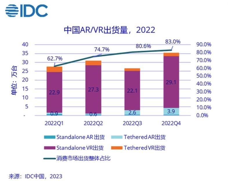 根(gen)據市場調研機構 IDC 發布的(de)數據,2022 年中國(guo) XR 市場硬(ying)件出貨量(liang)超(chao)過 120 萬臺(tai),其中第四(si)季度消(xiao)費(fei)級(ji)設備(bei)占比提升到(dao)了 83%。同時中國(guo)市場的(de) VR 設備(bei)出貨量(liang)首次(ci)突破了 100 萬臺(tai),AR 設備(bei)的(de)出貨量(liang)也(ye)首次(ci)突破了 10 萬臺(tai)。