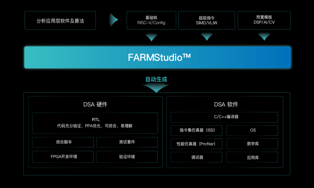 使用者只需在最初分析應用層(ceng)軟件(jian)(jian)和算法(fa)之(zhi)后,將基礎核、“超級指(zhi)令(ling)”和芯易薈(hui)提供的預置模板(ban)這三項輸入(ru)到FARMStudio工具中,“點一個(ge)按(an)鈕(niu)”就(jiu)能(neng)自動生成DSA硬(ying)件(jian)(jian)和軟件(jian)(jian)。其中,硬(ying)件(jian)(jian)包(bao)括RTL,以及綜合腳本、測試套(tao)件(jian)(jian)、FPGA開發環(huan)境,與驗證環(huan)境。軟件(jian)(jian)則是工具鏈,包(bao)括編譯器(qi)、指(zhi)令(ling)集仿真(zhen)器(qi)(ISS)、性能(neng)仿真(zhen)器(qi)(Profiler)、OS、數(shu)學庫(ku)、調(diao)試器(qi)、應用軟件(jian)(jian)包(bao)等(deng)。