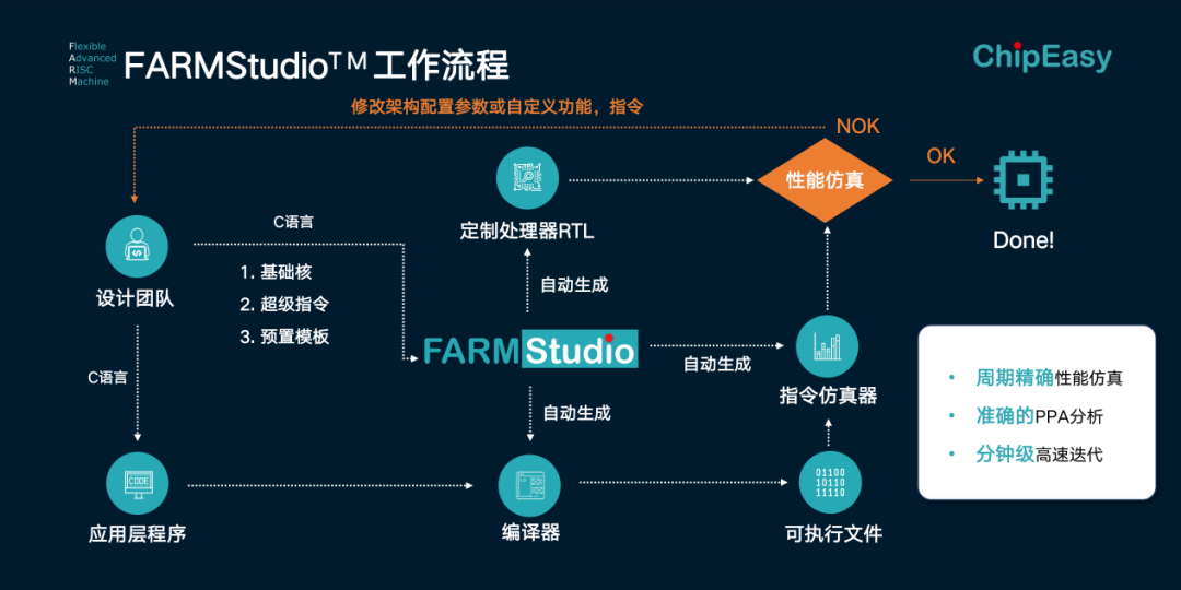 傳(chuan)統(tong)的(de)(de) EDA 工(gong)(gong)具使用(yong)“經驗(yan)(yan)法則”,需(xu)要設(she)(she)計人員根據個人或某一團隊的(de)(de)經驗(yan)(yan)對設(she)(she)計流程進行優化。而FARMStudio恰恰是頂尖芯片設(she)(she)計人員的(de)(de)“經驗(yan)(yan)池”,這(zhe)個工(gong)(gong)具是眾多(duo)芯片設(she)(she)計經驗(yan)(yan)的(de)(de)集大成(cheng)者(zhe),內(nei)置了豐富(fu)的(de)(de)處理(li)器設(she)(she)計可選(xuan)配置,同(tong)時也提供豐富(fu)的(de)(de)預(yu)制模板資源供芯片設(she)(she)計者(zhe)調(diao)用(yong)。如此,使用(yong)FARMStudio的(de)(de)芯片設(she)(she)計者(zhe)將算(suan)法以C語言的(de)(de)形式輸入給系統(tong),系統(tong)就會(hui)在(zai)數(shu)分鐘內(nei)自動生成(cheng)該算(suan)法的(de)(de)DSA處理(li)器和配套工(gong)(gong)具鏈,最大程度縮(suo)短(duan)產品上市時間(jian)。