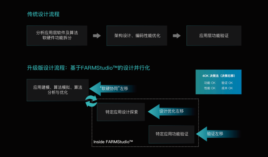 到了FARMStudio,流程設(she)(she)(she)置有所變(bian)動。通過對(dui)應用(yong)建模(mo)、算法(fa)模(mo)擬、算法(fa)分析和優化等一系列技術升(sheng)級,FARMStudio能夠使架構(gou)和軟硬件(jian)實(shi)現(xian)(xian)方案的(de)決策完(wan)全基(ji)于確定的(de)功能設(she)(she)(she)計(ji)(ji)、驗證結(jie)果(guo)和PPA數據,最大程度減少決策面臨(lin)的(de)不確定性(xing)和風險,且硬件(jian)設(she)(she)(she)計(ji)(ji)軟件(jian)化可實(shi)現(xian)(xian)芯片設(she)(she)(she)計(ji)(ji)中修改困難的(de)問題,幫(bang)助(zhu)芯片設(she)(she)(she)計(ji)(ji)者快(kuai)速收斂和驗證,最終快(kuai)速迭(die)代(dai)硬件(jian)設(she)(she)(she)計(ji)(ji)以最佳的(de)PPA實(shi)現(xian)(xian),在降低(di)成本的(de)同(tong)時提升(sheng)芯片質量。