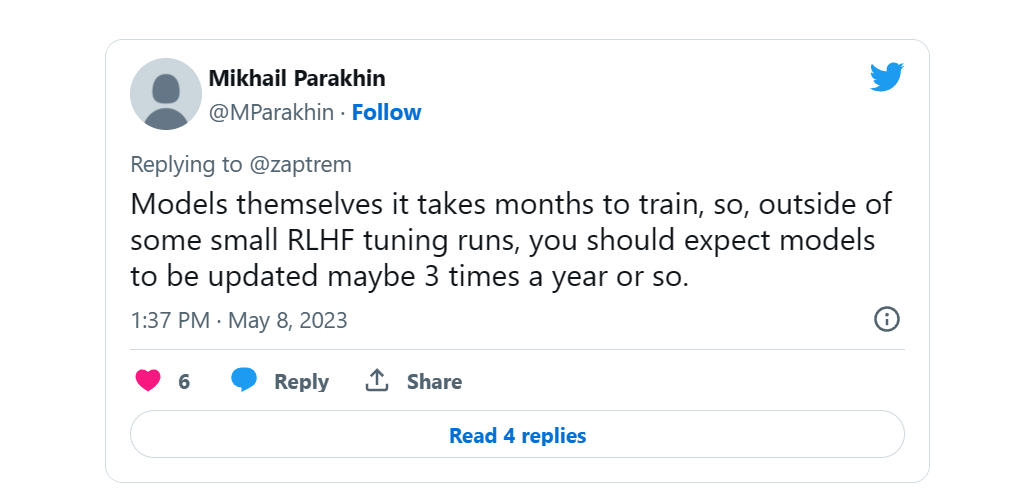 不幸(xing)的(de)是,關于下(xia)一個模(mo)(mo)型的(de)預(yu)期,目前(qian)仍沒有明確的(de)細節(jie)。另外,OpenAI首席執行官Sam Altman說(shuo),預(yu)計該公司開(kai)發的(de)下(xia)一個模(mo)(mo)型GPT-5目前(qian)還沒有進入訓練(lian)階(jie)段(duan),并補充說(shuo)它在一段(duan)時間內不會出現(xian)。這(zhe)聽起來可能與帕拉金的(de)說(shuo)法形成對(dui)比,因為我們已經快到(dao)2023年的(de)中(zhong)期了,而(er)我們得到(dao)的(de)只(zhi)是一個模(mo)(mo)型更新。