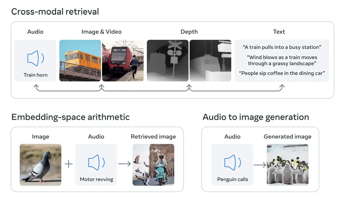 Meta公司說,其模型ImageBind是第一個將六種類型的數據結合到一個單一的嵌入空間的模型。該模型包括的六種數據是:視覺(圖像和視頻形式);熱能(紅外圖像);文本;音頻;深度信息;以及最有趣的--由慣性測量單元或IMU產生的運動讀數。(IMU存在于手機和智能手表中,它們被用于一系列任務,從將手機從橫向切換到縱向到區分不同類型的身體活動)。
