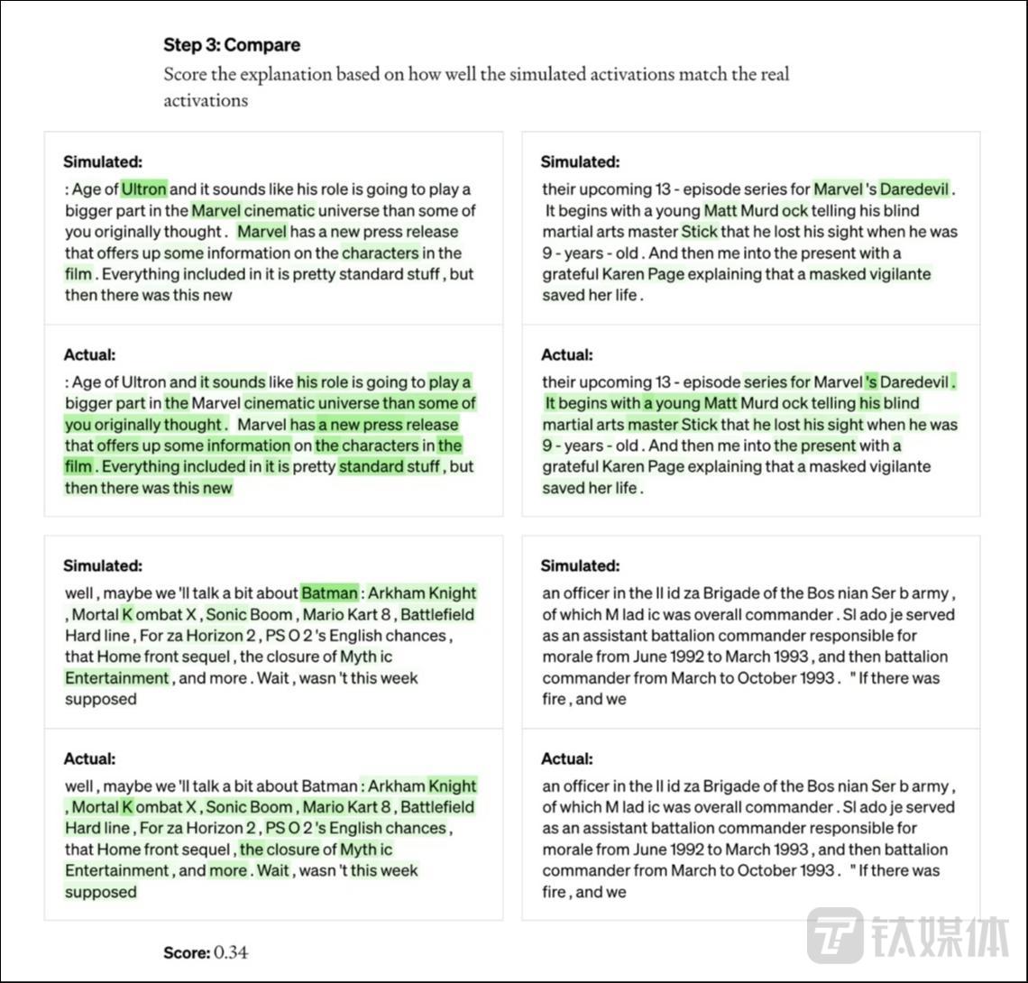 最后評估打分,對比(bi)GPT-4模擬神經元(yuan)和(he)GPT-2真(zhen)實神經元(yuan)的(de)結(jie)果的(de)準確度,在下圖這個例子中,GPT-4 的(de)得分為(wei)0.34。