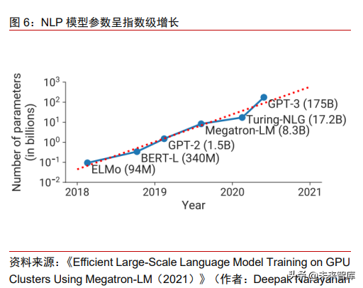 AI 大(da)模型(xing)(xing)參數(shu)呈指(zhi)數(shu)級增長(chang)(chang),新“摩爾定律”呼之欲出。近年來(lai),隨著算(suan)力以(yi)及數(shu)據 集快速發展(zhan)(zhan),基于 Transformer 模型(xing)(xing)的(de) NLP(Natural Language Processing,自然(ran)語(yu)言(yan)處 理(li))算(suan)法發展(zhan)(zhan)迅(xun)速。AI 大(da)模型(xing)(xing)具有“涌現(xian)能(neng)力”,當訓練量(liang)超過某個閾值時(shi),模型(xing)(xing)就會解 鎖“涌現(xian)能(neng)力”,即(ji)模型(xing)(xing)精度會突然(ran)暴增。因此,最先(xian)進的(de) NLP 以(yi)及 CV(Computer Vision, 計算(suan)機(ji)視覺)模型(xing)(xing)中的(de)參數(shu)數(shu)量(liang)均(jun)持(chi)續(xu)增長(chang)(chang),近年來(lai)呈指(zhi)數(shu)增長(chang)(chang)態勢(shi)。