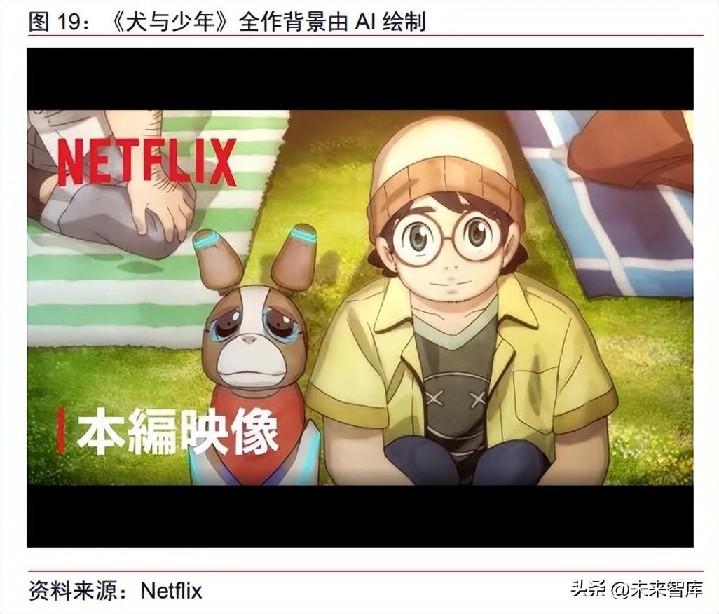AIGC+圖(tu)像視(shi)頻:推(tui)動影視(shi)娛(yu)樂行業降本(ben)增效。在(zai)影視(shi)娛(yu)樂領(ling)(ling)域,AI 已(yi)具(ju)備(bei)圖(tu)像、視(shi) 頻以及 3D 建(jian)模的(de)(de)創作(zuo)(zuo)能力。在(zai)圖(tu)片(pian)(pian)領(ling)(ling)域,根據 6pen 預測,若(ruo)未來五年 10%-30%的(de)(de)圖(tu)片(pian)(pian) 內容由 AI 參與(yu)生成(cheng)(cheng),市場(chang)規模有望超 600 億元。在(zai)視(shi)頻領(ling)(ling)域,2023 年 1 月,日(ri)本(ben)奈(nai)飛(Netflix JP)和日(ri)本(ben) WIT 工(gong)作(zuo)(zuo)室、微軟小冰(bing)公司日(ri)本(ben)分部(rinna)共同制作(zuo)(zuo)了動畫(hua)(hua)《犬與(yu)少(shao)年》, 成(cheng)(cheng)為歷史(shi)首次使用 AI 生成(cheng)(cheng)背景的(de)(de)商(shang)業動畫(hua)(hua)片(pian)(pian)。除去人物(wu)及動物(wu)角色,繪制工(gong)作(zuo)(zuo)絕大部分由 AI 完成(cheng)(cheng)。