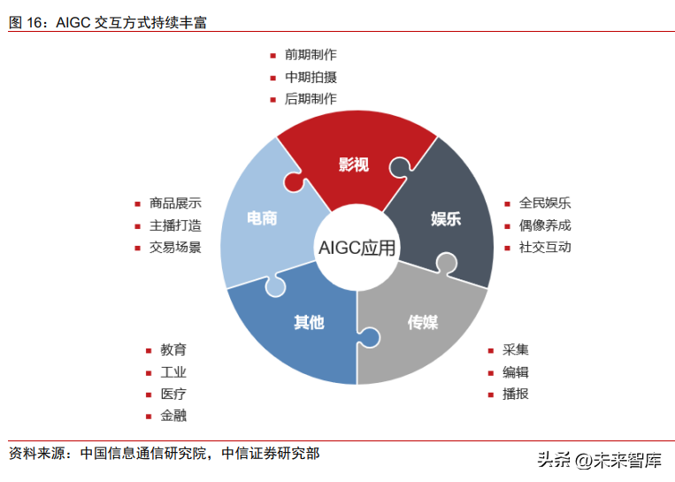 根據《GPTs are GPTs: An Early Look at the Labor Market Impact Potential of Large Language Models(2023)》(作者:Tyna Eloundou 等),AIGC 或對 80%以上的勞動者 產生影響。同時,AIGC 也可在前沿領域催化出新的產業機會,AIGC 大幅加快數字內容創 作及數字人產業發展,推動元宇宙產業(ye)加速落地。考慮到 AIGC 需強(qiang)大(da)的(de)硬件(jian)支(zhi)撐(cheng)以及(ji)在 全行(xing)業(ye)廣(guang)闊的(de)應(ying)用空(kong)間,我們重點推(tui)薦三(san)條投資主線:算力(li)硬件(jian)支(zhi)撐(cheng)、推(tui)動行(xing)業(ye)生(sheng)(sheng)產效(xiao)率 顛覆式提升、催生(sheng)(sheng)元宇(yu)宙發(fa)展新生(sheng)(sheng)態。