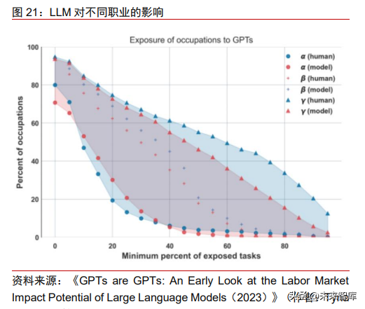 AIGC 市(shi)場有望(wang)超萬億元 AIGC 或影(ying)響 80%勞(lao)動(dong)力的(de) 10%工(gong)(gong)(gong)作(zuo)(zuo)(zuo)任(ren)務(wu)(wu)(wu),并大幅(fu)提升(sheng)(sheng)勞(lao)動(dong)者工(gong)(gong)(gong)作(zuo)(zuo)(zuo)效(xiao)(xiao)率。AI 大模(mo)型 在文字、圖像(xiang)視頻等(deng)方面已(yi)具備了一(yi)定的(de)創造能力,在非手工(gong)(gong)(gong)操作(zuo)(zuo)(zuo)以及人(ren)(ren)際(ji)交流的(de)工(gong)(gong)(gong)作(zuo)(zuo)(zuo)場 景(jing)中均(jun)可(ke)輔助甚至代替人(ren)(ren)力完(wan)成工(gong)(gong)(gong)作(zuo)(zuo)(zuo)任(ren)務(wu)(wu)(wu)。根據《GPTs are GPTs: An Early Look at the Labor Market Impact Potential of Large Language Models(2023)》(作(zuo)(zuo)(zuo)者:Tyna Eloundou 等(deng)),在美(mei)國平(ping)均(jun)一(yi)個(ge)職業當(dang)中約(yue)有 15%的(de)工(gong)(gong)(gong)作(zuo)(zuo)(zuo)任(ren)務(wu)(wu)(wu)會受到(dao) AI 大模(mo)型影(ying)響;大約(yue) 80%的(de)美(mei) 國勞(lao)動(dong)者可(ke)能有至少 10%的(de)工(gong)(gong)(gong)作(zuo)(zuo)(zuo)任(ren)務(wu)(wu)(wu)受到(dao) AI 大模(mo)型影(ying)響,而(er)約(yue) 19%的(de)勞(lao)動(dong)者可(ke)能有至少 50%的(de)工(gong)(gong)(gong)作(zuo)(zuo)(zuo)任(ren)務(wu)(wu)(wu)受到(dao)影(ying)響。另外,AIGC 已(yi)可(ke)在日(ri)常辦(ban)公(gong)場景(jing)中大幅(fu)提升(sheng)(sheng)員工(gong)(gong)(gong)工(gong)(gong)(gong)作(zuo)(zuo)(zuo)效(xiao)(xiao)率, 根據新華社報道,斯坦福大學和(he)麻省(sheng)理工(gong)(gong)(gong)學院針對一(yi)家技(ji)術(shu)企業的(de)最新研究結果顯示(shi),AI 可(ke)提升(sheng)(sheng)技(ji)術(shu)支持(chi)員工(gong)(gong)(gong)平(ping)均(jun) 14%的(de)勞(lao)動(dong)生產(chan)率,“新手和(he)低技(ji)能員工(gong)(gong)(gong)”的(de)工(gong)(gong)(gong)作(zuo)(zuo)(zuo)速度則能提升(sheng)(sheng) 35%。