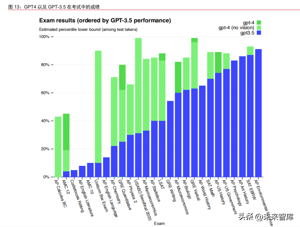 GPT-4 迎來巨大性能升(sheng)級,OpenAI 占得 AIGC 發展先機。根(gen)據《GPT-4 Technical Report(2023)》(作者 OpenAI)內(nei)容(rong),GPT-4 可以接受圖(tu)片(pian)輸(shu)入(ru),并具備“類似(si)人類” 的(de)圖(tu)片(pian)解讀(du)能力(li);GPT-4 在 60%的(de) AP 考試科目(mu)中取得了(le) 5 分(fen)(fen)(滿分(fen)(fen)),較 GPT-3.5 提(ti)(ti)升(sheng) 30%以上;GPT-4 也在研(yan)究生(sheng)(sheng)入(ru)門考試 GRE 中取得了(le) 339+4 的(de)成績(ji),超越 95%的(de)應試者。 GPT-4 引入(ru)多模態為后(hou)續生(sheng)(sheng)成音頻、圖(tu)片(pian)、視頻打(da)下了(le)堅(jian)實基礎。憑(ping)借微軟全生(sheng)(sheng)態助(zhu)力(li)以 及 ChatGPT 在全球范圍內(nei)的(de)“出圈”表現,我(wo)們認為 OpenAI 將在 AIGC 領域加(jia)速迭(die)代, 持續提(ti)(ti)升(sheng)模型(xing)內(nei)容(rong)生(sheng)(sheng)成以及邏輯推(tui)理能力(li),占得 AIGC 發展先機。