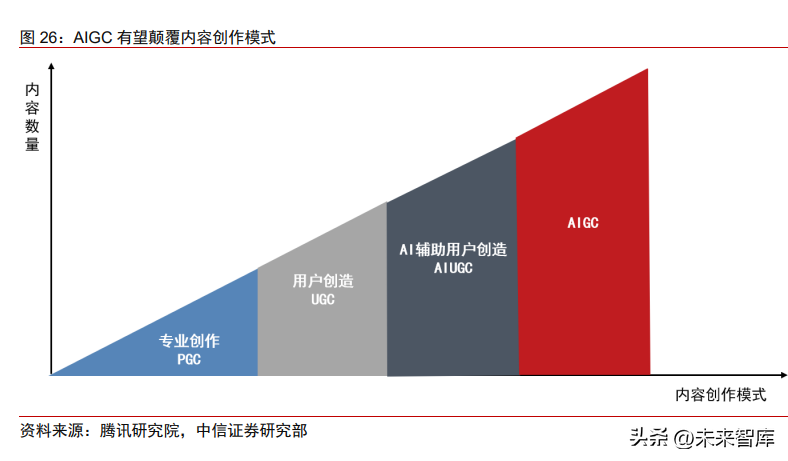 AIGC 將走過三個發展階(jie)(jie)(jie)段(duan)(duan),人(ren)機協同時代即(ji)將到(dao)來。當(dang)前,內(nei)(nei)(nei)容(rong)創造已(yi)(yi)由 PGC (Professional Generated Content,專業生(sheng)(sheng)(sheng)產內(nei)(nei)(nei)容(rong))轉向 UGC(User Generated Content, 用(yong)戶生(sheng)(sheng)(sheng)成(cheng)(cheng)內(nei)(nei)(nei)容(rong)),AI 輔助內(nei)(nei)(nei)容(rong)生(sheng)(sheng)(sheng)成(cheng)(cheng)(AIUGC)和 AIGC 也正在全面普及(ji)。根據百(bai)度 CEO 李(li) 彥宏的(de)(de)判斷,AIGC 將走過三個發展階(jie)(jie)(jie)段(duan)(duan):第一(yi)個階(jie)(jie)(jie)段(duan)(duan),被稱之為(wei)(wei) AIGC 的(de)(de)“助手階(jie)(jie)(jie)段(duan)(duan)”, AIGC 用(yong)來輔助人(ren)類進行(xing)內(nei)(nei)(nei)容(rong)生(sheng)(sheng)(sheng)產,比如生(sheng)(sheng)(sheng)產有(you)聲書、輔助視頻創作等;第二個階(jie)(jie)(jie)段(duan)(duan),被 稱之為(wei)(wei) AIGC 的(de)(de)“協作階(jie)(jie)(jie)段(duan)(duan)”,AIGC 以(yi)虛實并存的(de)(de)虛擬人(ren)形態出現,形成(cheng)(cheng)人(ren)機共生(sheng)(sheng)(sheng)的(de)(de)局面。 第三個階(jie)(jie)(jie)段(duan)(duan),即(ji) AIGC 的(de)(de)“原創階(jie)(jie)(jie)段(duan)(duan)”,AIGC 將獨立完(wan)成(cheng)(cheng)內(nei)(nei)(nei)容(rong)創作。我(wo)們認為(wei)(wei),隨著 AI 大模(mo)型已(yi)(yi)具備(bei)多模(mo)態的(de)(de)內(nei)(nei)(nei)容(rong)創造能力,AIGC 已(yi)(yi)具備(bei)大規模(mo)應(ying)用(yong)條件,人(ren)機協同時代即(ji)將 到(dao)來。