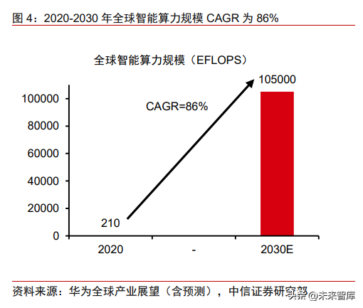 全(quan)球(qiu)(qiu)智(zhi)(zhi)能(neng)(neng)算(suan)(suan)力(li)規(gui)模高速發(fa)展,2026 年(nian)(nian)中國(guo)(guo)智(zhi)(zhi)能(neng)(neng)算(suan)(suan)力(li)規(gui)模有(you)望增(zeng)(zeng)(zeng)至(zhi) 1271.4EFLOPS。 根據華為預測(ce),未來 AI 將從感(gan)知(zhi)走向認知(zhi),創造(zao)能(neng)(neng)力(li)不斷增(zeng)(zeng)(zeng)強(qiang),AI 將走進日(ri)常(chang)生(sheng)活并(bing)賦(fu) 予萬物智(zhi)(zhi)能(neng)(neng),算(suan)(suan)力(li)需(xu)求將高速增(zeng)(zeng)(zeng)長,2030 年(nian)(nian)全(quan)球(qiu)(qiu)智(zhi)(zhi)能(neng)(neng)算(suan)(suan)力(li)有(you)望達(da)到 105ZFLOPS(每(mei)秒(miao)(miao) 10 21 次(ci)浮點(dian)計算(suan)(suan)),對比 2020 年(nian)(nian)增(zeng)(zeng)(zeng)長 500 倍。目前,國(guo)(guo)內頭部科技企(qi)業(ye)均(jun)發(fa)力(li)布局 AI 大 模型,需(xu)依(yi)托高算(suan)(suan)力(li)系統構建,預計國(guo)(guo)內智(zhi)(zhi)能(neng)(neng)算(suan)(suan)力(li)規(gui)模將保持高增(zeng)(zeng)(zeng)。根據 IDC 數據,2022 年(nian)(nian)中國(guo)(guo)智(zhi)(zhi)能(neng)(neng)算(suan)(suan)力(li)規(gui)模達(da)到 268.0EFLOPS(每(mei)秒(miao)(miao) 10 18 次(ci)浮點(dian)運算(suan)(suan)),預計 2026 年(nian)(nian)智(zhi)(zhi)能(neng)(neng)算(suan)(suan)力(li) 規(gui)模將進入 ZFLOPS 級別,達(da)到 1271.4EFLOPS。
