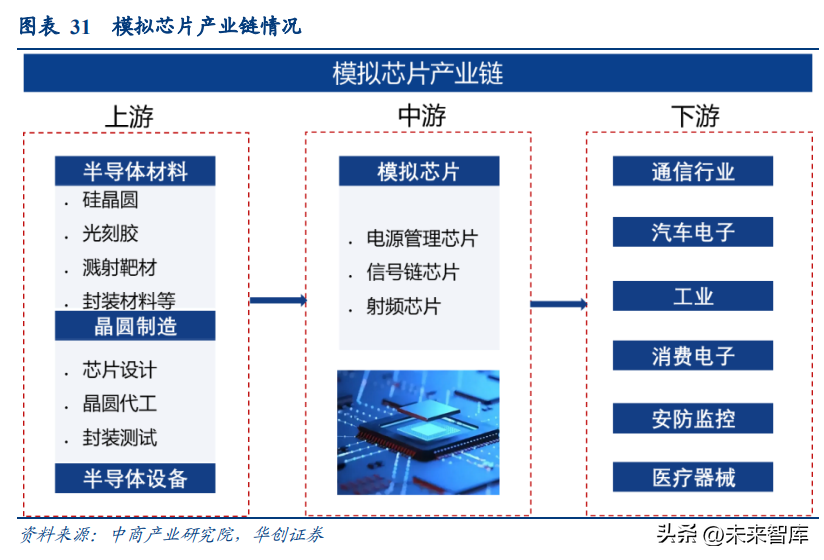 模(mo)(mo)擬芯(xin)(xin)(xin)片(pian)下游應用種類豐富。模(mo)(mo)擬芯(xin)(xin)(xin)片(pian)上游包括半(ban)導體(ti)材料、晶圓制造和(he)(he)半(ban)導體(ti)設備; 模(mo)(mo)擬芯(xin)(xin)(xin)片(pian)按功能(neng)劃分(fen)可分(fen)為(wei)電(dian)源管理芯(xin)(xin)(xin)片(pian)、信號鏈芯(xin)(xin)(xin)片(pian)和(he)(he)射頻芯(xin)(xin)(xin)片(pian);模(mo)(mo)擬芯(xin)(xin)(xin)片(pian)下游應用 領域十分(fen)廣泛(fan),包含通信行業(ye)、汽車電(dian)子、工業(ye)、消費電(dian)子、安防監控、醫療器(qi)械等。