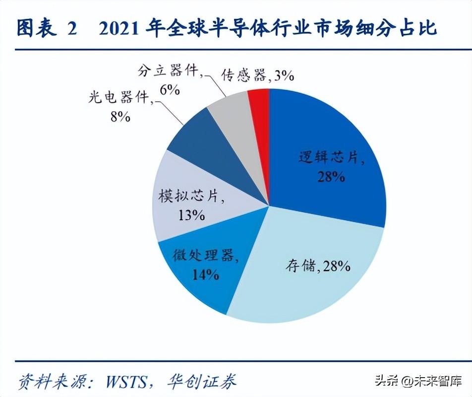 半導體指常溫下導電性能介于導體與絕緣體之間的材料;集成電路(IC,Integrated Circuit)也常稱為芯片或微芯片(pian),是(shi)一種微型電(dian)(dian)(dian)子(zi)(zi)器(qi)件,其通過在(zai)(zai)一塊半(ban)導(dao)體(ti)(ti)基板上, 利用氧化(hua)、蝕刻、擴散等(deng)方法,將(jiang)眾多的(de)電(dian)(dian)(dian)子(zi)(zi)電(dian)(dian)(dian)路組成(cheng)(cheng)的(de)各式二極(ji)體(ti)(ti)、電(dian)(dian)(dian)晶體(ti)(ti)等(deng)電(dian)(dian)(dian)子(zi)(zi)元(yuan) 件集(ji)成(cheng)(cheng)在(zai)(zai)一個微小面積(ji)上,以完成(cheng)(cheng)某(mou)一特定邏輯功(gong)(gong)能(neng),進(jin)而達成(cheng)(cheng)預先設定好(hao)的(de)電(dian)(dian)(dian)路功(gong)(gong)能(neng)。 集(ji)成(cheng)(cheng)電(dian)(dian)(dian)路為半(ban)導(dao)體(ti)(ti)的(de)重要組成(cheng)(cheng)部分(fen)(fen),集(ji)成(cheng)(cheng)電(dian)(dian)(dian)路行業種類豐富(fu)。半(ban)導(dao)體(ti)(ti)行業主要分(fen)(fen)為集(ji)成(cheng)(cheng) 電(dian)(dian)(dian)路、分(fen)(fen)立器(qi)件、光學電(dian)(dian)(dian)子(zi)(zi)和(he)傳感(gan)器(qi)四個部分(fen)(fen)。根據(ju) WSTS 數據(ju),2021 年全球半(ban)導(dao)體(ti)(ti)市 場(chang)規模為 5559 億美元(yuan),集(ji)成(cheng)(cheng)電(dian)(dian)(dian)路的(de)市場(chang)規模達 4630 億美元(yuan),占比(bi)為 83.2%,為半(ban)導(dao)體(ti)(ti) 市場(chang)的(de)重要組成(cheng)(cheng)部分(fen)(fen)。根據(ju)集(ji)成(cheng)(cheng)電(dian)(dian)(dian)路功(gong)(gong)能(neng)的(de)不同(tong),集(ji)成(cheng)(cheng)電(dian)(dian)(dian)路又可(ke)以細(xi)分(fen)(fen)為存儲器(qi)、邏輯 芯片(pian)、模擬芯片(pian)和(he)微處理器(qi)等(deng)類別(bie)。