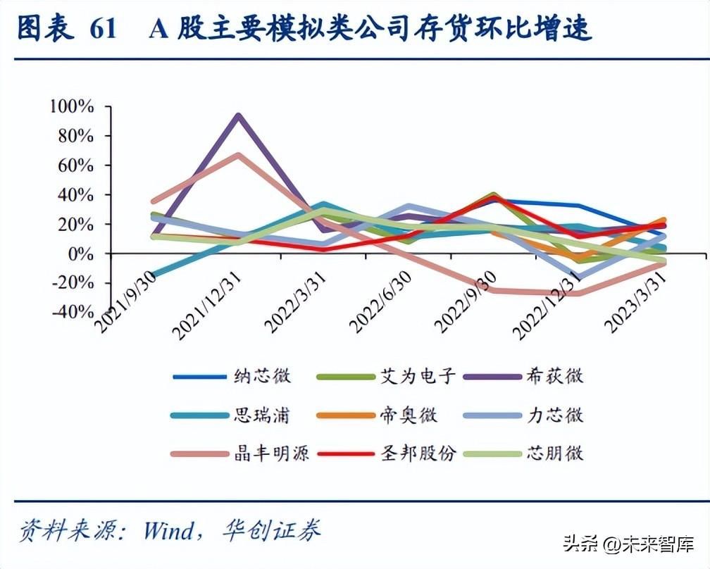 下(xia)游(you)消(xiao)(xiao)費(fei)(fei)(fei)電(dian)子(zi)板(ban)塊庫(ku)(ku)存(cun)(cun)(cun)(cun)去化效果顯著,產(chan)業(ye)鏈傳導下(xia)模(mo)(mo)擬(ni)公(gong)(gong)司庫(ku)(ku)存(cun)(cun)(cun)(cun)亦有望得到(dao)消(xiao)(xiao)化。近 年(nian)受影響最大的(de)消(xiao)(xiao)費(fei)(fei)(fei)電(dian)子(zi)板(ban)塊方(fang)面(mian),行(xing)業(ye)庫(ku)(ku)存(cun)(cun)(cun)(cun)水平連(lian)續多個季度降(jiang)低,庫(ku)(ku)存(cun)(cun)(cun)(cun)壓力顯著降(jiang) 低。選取 SW 消(xiao)(xiao)費(fei)(fei)(fei)電(dian)子(zi)市值前十的(de)企(qi)業(ye)存(cun)(cun)(cun)(cun)貨(huo)進行(xing)分析,自 2022 年(nian)下(xia)半(ban)年(nian)開始消(xiao)(xiao)費(fei)(fei)(fei)電(dian)子(zi)企(qi) 業(ye)的(de)存(cun)(cun)(cun)(cun)貨(huo)開始顯著下(xia)降(jiang)。考慮到(dao)訂單(dan)的(de)時滯(zhi)性,下(xia)游(you)庫(ku)(ku)存(cun)(cun)(cun)(cun)壓力的(de)緩解已(yi)逐步(bu)傳導至模(mo)(mo)擬(ni) IC 公(gong)(gong)司,庫(ku)(ku)存(cun)(cun)(cun)(cun)有希望得到(dao)進一步(bu)消(xiao)(xiao)化。終端消(xiao)(xiao)費(fei)(fei)(fei)復(fu)(fu)(fu)蘇趨勢明確,疊加庫(ku)(ku)存(cun)(cun)(cun)(cun)優化有望驅動模(mo)(mo)擬(ni) IC 設(she)計(ji)公(gong)(gong)司觸底反(fan)彈(dan)。隨著年(nian)初 “乙(yi)管乙(yi)類(lei)”政策落(luo)地,市場對于消(xiao)(xiao)費(fei)(fei)(fei)、經濟復(fu)(fu)(fu)蘇樂觀預計(ji)不斷強化。疫情后消(xiao)(xiao)費(fei)(fei)(fei)信心 逐步(bu)回暖,消(xiao)(xiao)費(fei)(fei)(fei)電(dian)子(zi)等(deng)多個下(xia)游(you)有望重回增長軌道。參(can)考產(chan)業(ye)鏈反(fan)饋與國際大廠法說會(hui) 預測,我們(men)預計(ji)全球半(ban)導體周期將于 Q2 筑(zhu)底,三季度開始復(fu)(fu)(fu)蘇。庫(ku)(ku)存(cun)(cun)(cun)(cun)去化疊加下(xia)游(you)消(xiao)(xiao) 費(fei)(fei)(fei)復(fu)(fu)(fu)蘇,模(mo)(mo)擬(ni) IC 設(she)計(ji)公(gong)(gong)司今(jin)年(nian)有望觸底反(fan)彈(dan)。