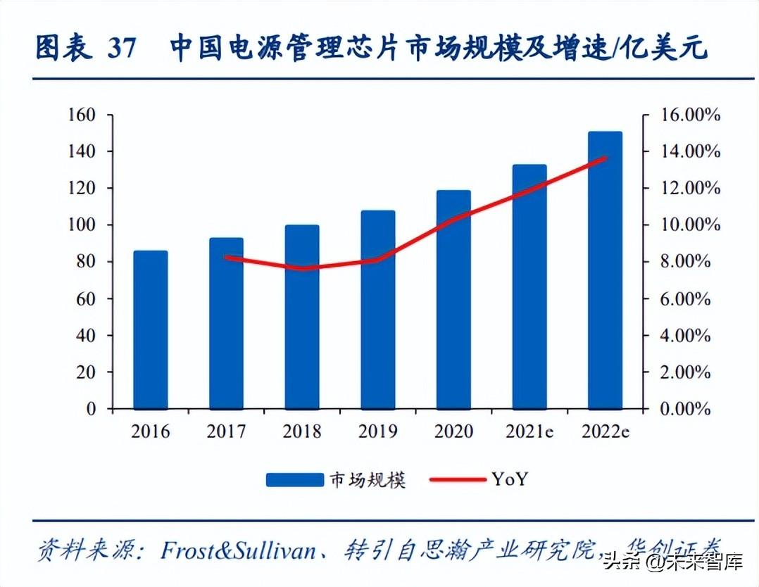 受益(yi)于(yu)(yu)下(xia)游市(shi)(shi)(shi)場(chang)發展(zhan),中(zhong)(zhong)(zhong)國(guo)(guo)電(dian)(dian)(dian)(dian)源(yuan)(yuan)(yuan)管(guan)理芯(xin)(xin)片(pian)(pian)(pian)市(shi)(shi)(shi)場(chang)快(kuai)速(su)(su)增(zeng)(zeng)長(chang)。隨著 5G 通信(xin)、新能源(yuan)(yuan)(yuan)汽(qi)車、 物聯網等下(xia)游市(shi)(shi)(shi)場(chang)的發展(zhan),對于(yu)(yu)電(dian)(dian)(dian)(dian)能應用(yong)效能的管(guan)理需求將持續(xu)增(zeng)(zeng)長(chang),從而帶動電(dian)(dian)(dian)(dian)源(yuan)(yuan)(yuan)管(guan) 理芯(xin)(xin)片(pian)(pian)(pian)市(shi)(shi)(shi)場(chang)的持續(xu)增(zeng)(zeng)長(chang)。2021 年中(zhong)(zhong)(zhong)國(guo)(guo)電(dian)(dian)(dian)(dian)源(yuan)(yuan)(yuan)管(guan)理芯(xin)(xin)片(pian)(pian)(pian)市(shi)(shi)(shi)場(chang)規模(mo)(mo)約為 132 億美元,隨著國(guo)(guo)產 電(dian)(dian)(dian)(dian)源(yuan)(yuan)(yuan)管(guan)理芯(xin)(xin)片(pian)(pian)(pian)在家用(yong)電(dian)(dian)(dian)(dian)器、3C 新興產品等領(ling)域(yu)的應用(yong)拓展(zhan),國(guo)(guo)產電(dian)(dian)(dian)(dian)源(yuan)(yuan)(yuan)管(guan)理芯(xin)(xin)片(pian)(pian)(pian)市(shi)(shi)(shi)場(chang)規模(mo)(mo) 有望實(shi)現快(kuai)速(su)(su)增(zeng)(zeng)長(chang)。雖然國(guo)(guo)內電(dian)(dian)(dian)(dian)源(yuan)(yuan)(yuan)管(guan)理芯(xin)(xin)片(pian)(pian)(pian)廠商(shang)起步較(jiao)(jiao)晚,但(dan)近(jin)年來(lai)國(guo)(guo)產替代趨勢(shi)增(zeng)(zeng)強, 部分本土電(dian)(dian)(dian)(dian)源(yuan)(yuan)(yuan)管(guan)理芯(xin)(xin)片(pian)(pian)(pian)設(she)(she)計企業的整體(ti)技術水平(ping)與國(guo)(guo)外設(she)(she)計公(gong)(gong)司的差距不(bu)斷(duan)縮小。目前, 國(guo)(guo)內電(dian)(dian)(dian)(dian)源(yuan)(yuan)(yuan)管(guan)理芯(xin)(xin)片(pian)(pian)(pian)產業公(gong)(gong)司相(xiang)對于(yu)(yu)國(guo)(guo)外競爭對手(shou)的總體(ti)規模(mo)(mo)仍較(jiao)(jiao)小,具備較(jiao)(jiao)大(da)的發展(zhan)空 間,且受益(yi)于(yu)(yu)下(xia)游市(shi)(shi)(shi)場(chang)的發展(zhan),中(zhong)(zhong)(zhong)國(guo)(guo)電(dian)(dian)(dian)(dian)源(yuan)(yuan)(yuan)管(guan)理芯(xin)(xin)片(pian)(pian)(pian)市(shi)(shi)(shi)場(chang)快(kuai)速(su)(su)增(zeng)(zeng)長(chang),中(zhong)(zhong)(zhong)國(guo)(guo)電(dian)(dian)(dian)(dian)源(yuan)(yuan)(yuan)管(guan)理芯(xin)(xin)片(pian)(pian)(pian)規 模(mo)(mo)有望持續(xu)增(zeng)(zeng)長(chang)。