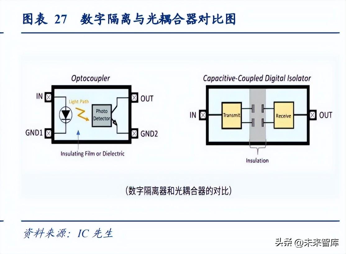 接(jie)(jie)口:接(jie)(jie)口產品主(zhu)要(yao)用于電(dian)子(zi)系(xi)統(tong)之間(jian)的數(shu)字信號傳輸,主(zhu)要(yao)包(bao)括隔(ge)離器、收(shou)發器、數(shu) 據(ju)緩沖(chong)器等。隔(ge)離器主(zhu)要(yao)用于提升(sheng)系(xi)統(tong)安全性(xing),將(jiang)輸入、輸出和工作電(dian)源(yuan)三者相互隔(ge)離, 可以分為光耦合器和數(shu)字隔(ge)離器,其中數(shu)字隔(ge)離器應用最為廣泛;收(shou)發器是可以支持信號發送和接(jie)(jie)收(shou)的一種產品;數(shu)據(ju)緩沖(chong)器可當數(shu)據(ju)在具有不(bu)同傳輸能力的元件之間(jian)通過時, 用來暫存這些數(shu)據(ju)。