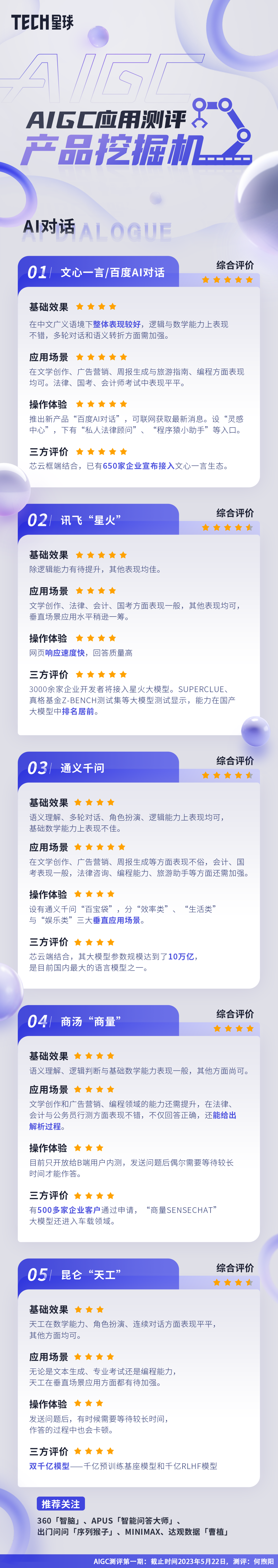 更聚焦大模(mo)型(xing)產(chan)品化的(de)Tech星球測評結(jie)果顯示,文心(xin)一言與訊飛星火表現不相上下(xia)。當(dang)然,訊飛星火正陷于市場質疑(yi)其是“套(tao)殼GPT”之(zhi)爭,而百度(du)目前已基于文心(xin)一言大模(mo)型(xing)推出(chu)搜索產(chan)品“百度(du)AI對話(hua)”(又名“搜索AI伙伴”),可進(jin)行聯網搜索、語音輸入,并設有眾多垂直場景入口,因(yin)此處于領(ling)跑(pao)階段(duan)。綜(zong)合(he)測評中,阿里(li)旗下(xia)的(de)“通(tong)義千問”在(zai)數學、編程能力稍遜一籌,其他方面表現良好。“商量(liang)”與“天工”則在(zai)實測中均出(chu)現等待時間較長、作答卡頓的(de)現象(xiang),產(chan)品化還有很長的(de)路要走。