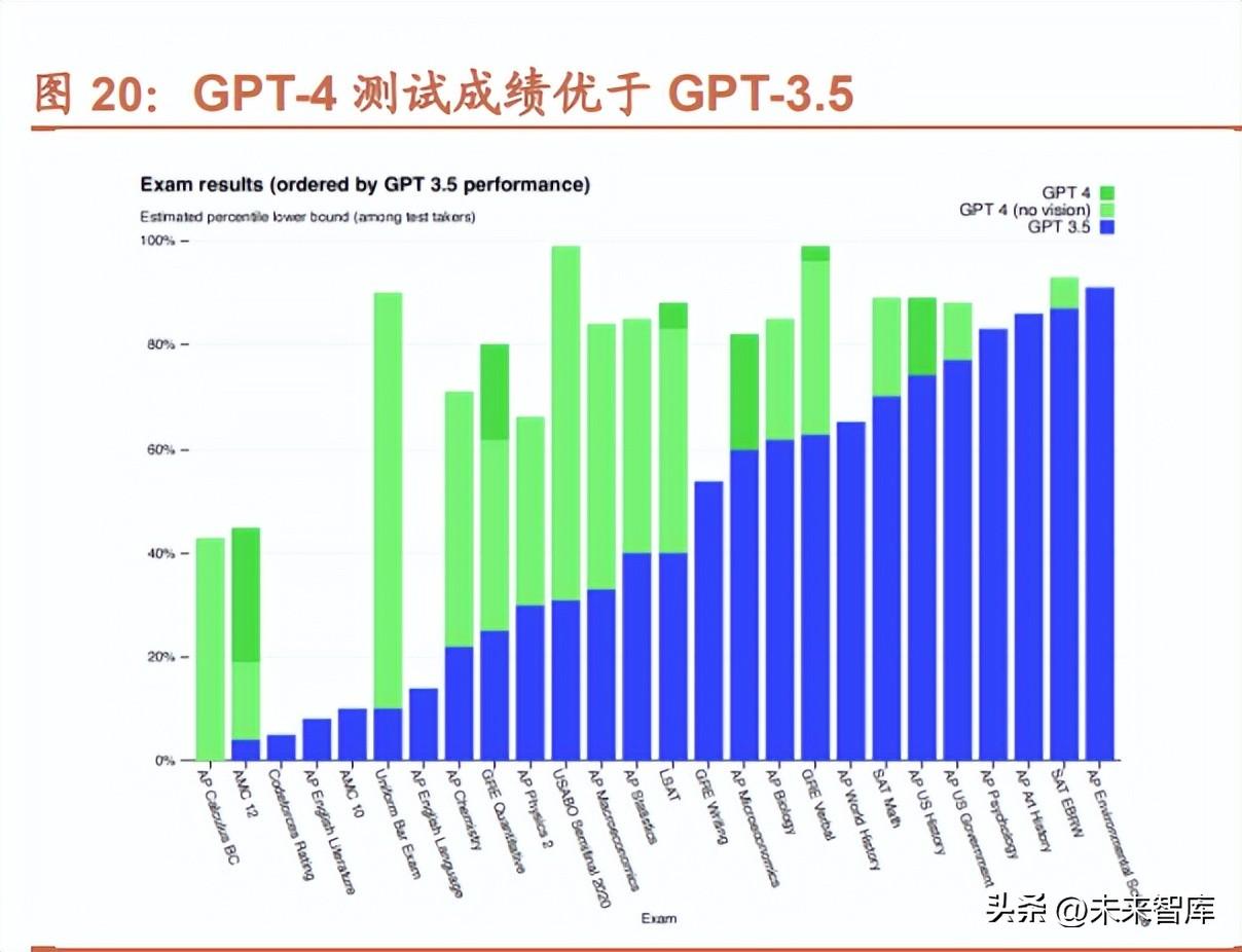 OpenAI 在 ChatGPT 成為爆款后又推出(chu)多模(mo)(mo)態(tai)(tai)大模(mo)(mo)型(xing) GPT-4。3 月 14 日(ri),OpenAI 公布多模(mo)(mo)態(tai)(tai)預訓練大模(mo)(mo)型(xing) GPT4,其在諸多方面進行了(le)升級:1)輸(shu)(shu)入端(duan)上(shang)限:GPT-4 文字輸(shu)(shu)入限制提升至 2.5 萬字,為 ChatGPT 的 8 倍左右;2) 多模(mo)(mo)態(tai)(tai)輸(shu)(shu)入能力(li)(li):能夠接(jie)受(shou)文本、圖像等形式的輸(shu)(shu)入;3)高級推理(li)能力(li)(li):在各種(zhong)專(zhuan)業和學(xue)術領域(yu)的基準測試(shi)中表現 出(chu)“人(ren)類水(shui)平”,多數成績(ji)優于 GPT-3.5。