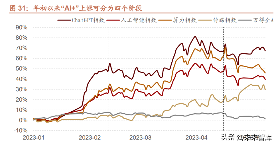 2023 年初以來(lai)“AI+”概念相關(guan)板塊漲(zhang)(zhang)幅均超 50%,當(dang)仁(ren)不(bu)讓成為(wei)主線(xian)。具(ju)體來(lai)看,此(ci)次上漲(zhang)(zhang)可細(xi)分(fen)為(wei)四個階段(duan)。