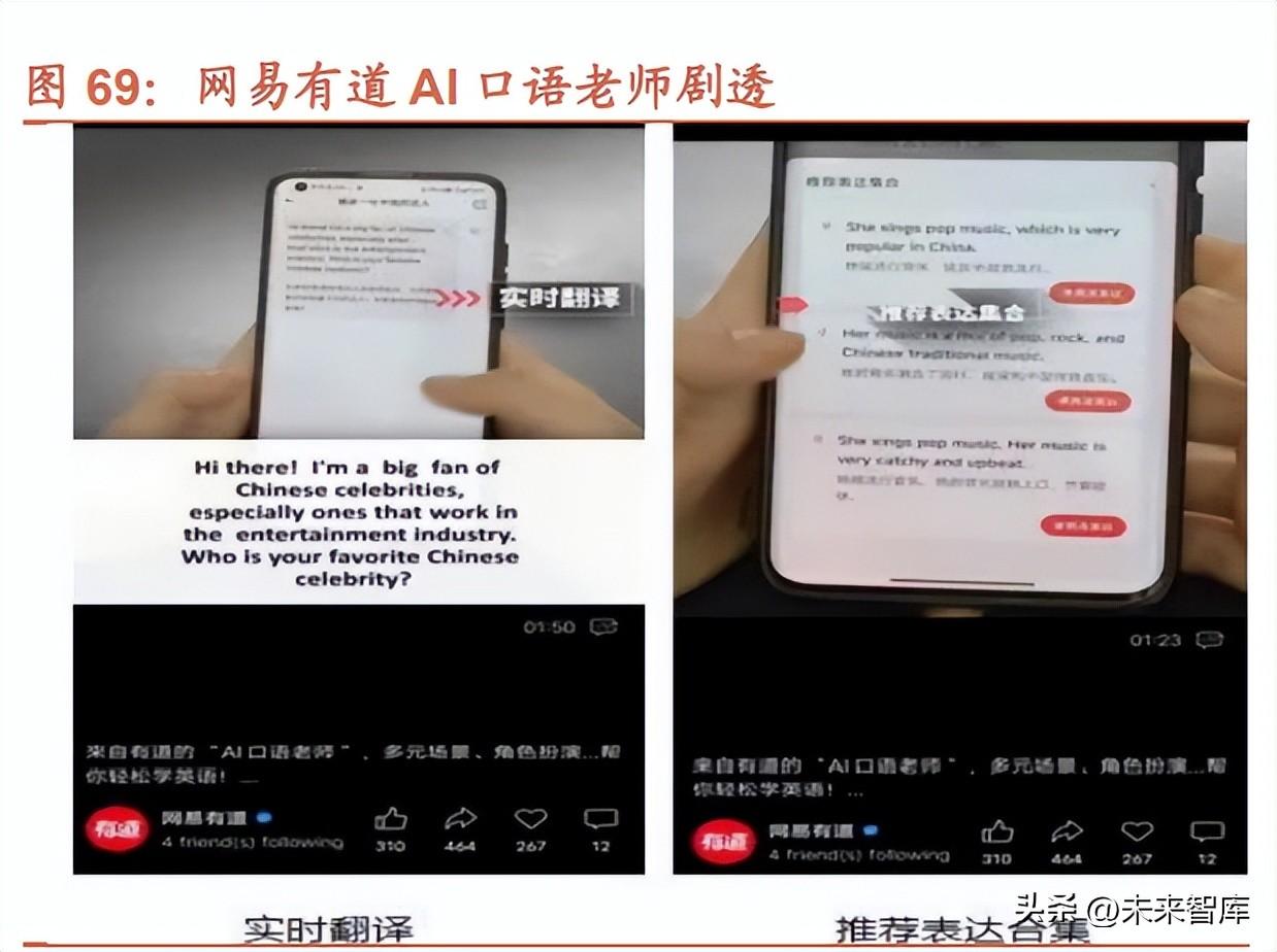 新東方、好未(wei)來等(deng)(deng)(deng)(deng)大(da)型(xing)教育(yu)集團和科技集團均推(tui)出(chu) AI+教育(yu)。新東方以智能答題(ti)器(qi)等(deng)(deng)(deng)(deng)硬件入手,結合智能設備可(ke)登錄 的(de)(de)(de) APP 等(deng)(deng)(deng)(deng),通過學(xue)(xue)(xue)(xue)生(sheng)答題(ti)和迭代測試(shi)情況(kuang),得(de)到(dao)學(xue)(xue)(xue)(xue)生(sheng)學(xue)(xue)(xue)(xue)習(xi)曲線(xian)、遺忘曲線(xian)、知識點歸因等(deng)(deng)(deng)(deng)分(fen)析,推(tui)出(chu)綜合個性化學(xue)(xue)(xue)(xue) 習(xi)方案。好未(wei)來教育(yu)于(yu) 2 月初上線(xian) AI 講解機(ji)器(qi)人,且未(wei)來將(jiang)利用(yong) ChatGPT 相關技術對學(xue)(xue)(xue)(xue)習(xi)機(ji)等(deng)(deng)(deng)(deng)產品進(jin)行迭代。5 月 5 日,網易有(you)道(dao)發布了基(ji)于(yu)“子(zi)曰”大(da)模(mo)(mo)型(xing)開(kai)(kai)發的(de)(de)(de) AI 口(kou)語(yu)老師(shi)(shi)劇透視頻,不同(tong)于(yu)以往只會(hui)進(jin)行死板劇本式(shi)對話的(de)(de)(de) AI 口(kou)語(yu)老師(shi)(shi),該 AI 口(kou)語(yu)老師(shi)(shi)為用(yong)戶提供(gong)了開(kai)(kai)放式(shi)的(de)(de)(de)聊天場景,更(geng)符(fu)合真實的(de)(de)(de)口(kou)語(yu)練習(xi)環境,并(bing)能夠在結束(shu)對話后快速 生(sheng)成(cheng)結果報告。同(tong)日,學(xue)(xue)(xue)(xue)而思(si)傳出(chu)正(zheng)自(zi)研(yan)數學(xue)(xue)(xue)(xue)大(da)模(mo)(mo)型(xing) MathGPT,且與年內推(tui)出(chu)基(ji)于(yu)該大(da)模(mo)(mo)型(xing)的(de)(de)(de)產品級應用(yong)。5 月 6 日,科大(da)訊(xun)飛(fei)發布訊(xun)飛(fei)星(xing)火認知大(da)模(mo)(mo)型(xing),并(bing)展(zhan)示了“大(da)模(mo)(mo)型(xing)+AI”的(de)(de)(de)功能,其中包含批改語(yu)文或英(ying)語(yu)作文,模(mo)(mo)擬口(kou)語(yu)老 師(shi)(shi)實景對話等(deng)(deng)(deng)(deng)。