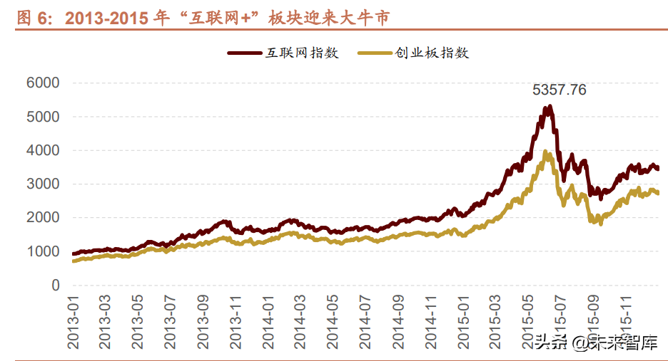 產業革命與(yu)政策加碼下(xia),2013-2015 年(nian)“互聯網(wang)+”板(ban)(ban)塊(kuai)(kuai)(kuai)迎來了史(shi)詩級行情。互聯網(wang)板(ban)(ban)塊(kuai)(kuai)(kuai)指數(shu)從(cong) 2013 年(nian)初(chu)(chu)的 930.96 一 路飆升至(zhi) 2015 年(nian) 6 月 12 日盤中的歷史(shi)高點 5357.76,最大漲(zhang)(zhang)幅達 475%。個(ge)股(gu)漲(zhang)(zhang)幅更是驚人,整(zheng)個(ge)“互聯網(wang)+”板(ban)(ban)塊(kuai)(kuai)(kuai) 出(chu)現(xian)多只十倍(bei)股(gu),其中“互聯網(wang)+金融(rong)”的龍(long)頭東方(fang)財富、同花(hua)順漲(zhang)(zhang)幅高達 49 倍(bei)、36 倍(bei)。在此輪行情背(bei)后(hou),是十年(nian)難遇 的創業板(ban)(ban)大牛(niu)市,創業板(ban)(ban)指從(cong) 2013 年(nian)年(nian)初(chu)(chu) 705.34 一直到 2015 年(nian)中創出(chu) 4037.96 歷史(shi)高點,漲(zhang)(zhang)幅達 473%。從(cong)走勢(shi) 上看,“互聯網(wang)+”板(ban)(ban)塊(kuai)(kuai)(kuai)與(yu)創業板(ban)(ban)走勢(shi)高度一致。