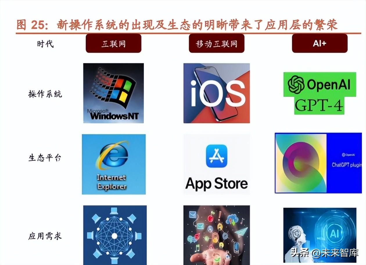 大(da)模型(xing)是(shi)人(ren)工智(zhi)能(neng)(neng)的(de)(de)(de)(de)核心入(ru)(ru)口。回顧(gu)歷次“入(ru)(ru)口革命”,Windows 系統降(jiang)低 PC 使(shi)用(yong)門檻,催發互聯網(wang)繁榮(rong)(rong);iPhone 的(de)(de)(de)(de)出現及其(qi) iOS 獨特生(sheng)(sheng)態成為(wei)了移(yi)動互聯網(wang)時代的(de)(de)(de)(de)導(dao)流入(ru)(ru)口,拉開了移(yi)動互聯網(wang)時代的(de)(de)(de)(de)序幕(mu),可見“新入(ru)(ru)口”的(de)(de)(de)(de)提供 和接入(ru)(ru)不(bu)僅(jin)能(neng)(neng)帶來系統和應用(yong)的(de)(de)(de)(de)繁榮(rong)(rong),同樣具(ju)有劃(hua)時代的(de)(de)(de)(de)重要意義。而正如通用(yong)大(da)模型(xing)之(zhi)于(yu) Windows 移(yi)動系統, ChatGPT Plugin 之(zhi)于(yu) iOS App Store,二者協同有望成為(wei)人(ren)工智(zhi)能(neng)(neng)以(yi)及萬物互聯網(wang)的(de)(de)(de)(de)核心入(ru)(ru)口,將為(wei)更(geng)多(duo)現實載(zai)體接 入(ru)(ru)大(da)模型(xing)提供契機。當越來越多(duo)的(de)(de)(de)(de)現實載(zai)體通過插件接入(ru)(ru)通用(yong)大(da)模型(xing),現代人(ren)類(lei)的(de)(de)(de)(de)生(sheng)(sheng)活(huo)可能(neng)(neng)發生(sheng)(sheng)顛覆(fu)性變化(hua),萬物互 聯的(de)(de)(de)(de)“AI+”時代或不(bu)再(zai)遙(yao)遠。