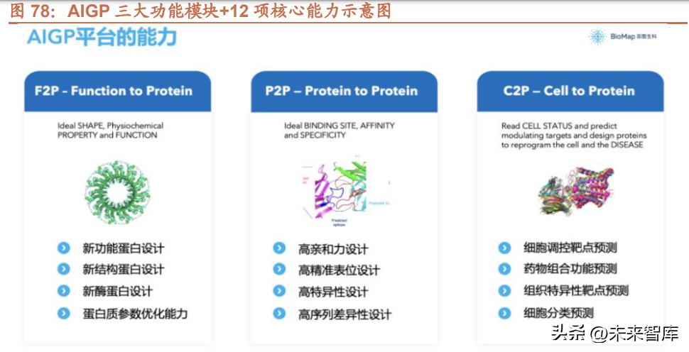 國內 AI+醫療緊隨其后,百(bai)圖(tu)生(sheng)(sheng)科(ke)(ke) AIGP 平臺(tai)發布(bu),提供多種(zhong)蛋白(bai)(bai)(bai)質(zhi)生(sheng)(sheng)成(cheng)能(neng)(neng)(neng)力。3 月 23 日,百(bai)圖(tu)生(sheng)(sheng)科(ke)(ke)在(zai)(zai)(zai)官方(fang)微信公眾 號發布(bu)文章(zhang)顯(xian)示,百(bai)圖(tu)生(sheng)(sheng)科(ke)(ke)在(zai)(zai)(zai)北京發布(bu)生(sheng)(sheng)命(ming)科(ke)(ke)學(xue)大(da)模(mo)型(xing)(xing)(xing)驅動(dong)的(de)(de) AIGP——AI Generated Protein 平臺(tai)。百(bai)圖(tu)生(sheng)(sheng)科(ke)(ke) (BioMap)是首家超大(da)規(gui)模(mo) AI 模(mo)型(xing)(xing)(xing)驅動(dong)的(de)(de)生(sheng)(sheng)命(ming)科(ke)(ke)學(xue)研發平臺(tai),成(cheng)立兩年多以(yi)來,百(bai)圖(tu)生(sheng)(sheng)科(ke)(ke)一(yi)直致力于打造生(sheng)(sheng)命(ming)科(ke)(ke)學(xue) 領域的(de)(de) AI 大(da)模(mo)型(xing)(xing)(xing),構(gou)(gou)建了千億參(can)數的(de)(de)跨(kua)模(mo)態大(da)模(mo)型(xing)(xing)(xing)“xTrimo”,該大(da)模(mo)型(xing)(xing)(xing)從(cong)跨(kua)物種(zhong)、跨(kua)模(mo)態的(de)(de)生(sheng)(sheng)命(ming)信息中學(xue)習蛋白(bai)(bai)(bai)質(zhi)如 何(he)構(gou)(gou)成(cheng)和實現功(gong)能(neng)(neng)(neng)、如何(he)相互作用、如何(he)組合(he)和調(diao)控(kong)細胞功(gong)能(neng)(neng)(neng)的(de)(de)關鍵(jian)規(gui)律,從(cong)而(er)破解(jie)生(sheng)(sheng)命(ming)的(de)(de)自然(ran)語言——蛋白(bai)(bai)(bai)質(zhi)。基(ji) 于大(da)模(mo)型(xing)(xing)(xing),AI 在(zai)(zai)(zai)一(yi)系(xi)列任務(wu)算法上(shang)取(qu)得(de)了明顯(xian)的(de)(de)進展,除了更好地(di)完成(cheng)結構(gou)(gou)預測等基(ji)礎任務(wu)外,也(ye)開始可以(yi)根(gen)據不同 的(de)(de)問題(ti)輸入,以(yi)生(sheng)(sheng)成(cheng)的(de)(de)方(fang)式(shi),設(she)計(ji)創新(xin)的(de)(de)蛋白(bai)(bai)(bai)質(zhi),來回答各種(zhong)生(sheng)(sheng)命(ming)科(ke)(ke)學(xue)問題(ti)。目前,百(bai)圖(tu)生(sheng)(sheng)科(ke)(ke) AIGP 平臺(tai)設(she)置了 3 類 功(gong)能(neng)(neng)(neng)模(mo)塊,分別是 Function to Protein Design(F2P,根(gen)據結構(gou)(gou)、功(gong)能(neng)(neng)(neng)、可開發性等功(gong)能(neng)(neng)(neng)指標設(she)計(ji)/優化(hua)蛋白(bai)(bai)(bai)質(zhi))、Protein to Protein Design(P2P,給(gei)定(ding)抗原等目標蛋白(bai)(bai)(bai),設(she)計(ji)與之以(yi)特定(ding)方(fang)式(shi)結合(he)的(de)(de)抗體(ti)等蛋白(bai)(bai)(bai))、以(yi)及 Cell to Protein Design (C2P,給(gei)定(ding)細胞,發現調(diao)控(kong)細胞功(gong)能(neng)(neng)(neng)的(de)(de)靶點蛋白(bai)(bai)(bai)并設(she)計(ji)相應調(diao)控(kong)蛋白(bai)(bai)(bai))。