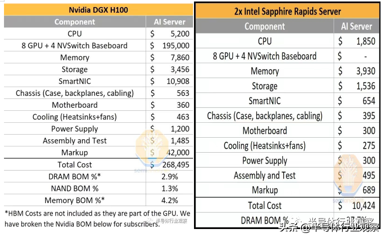 現在(zai)回頭(tou)看,英(ying)(ying)偉達這單收購(gou)的意圖非常明顯。從公司當前(qian)的銷售模式看來(銷售DGX和HGX),只要在(zai)設計中放入更多(duo)的自己(ji)的芯片,就能(neng)獲取更多(duo)的收益。參考下圖英(ying)(ying)偉達DGX H100的成(cheng)本跟普通服(fu)務器的成(cheng)本對(dui)比。