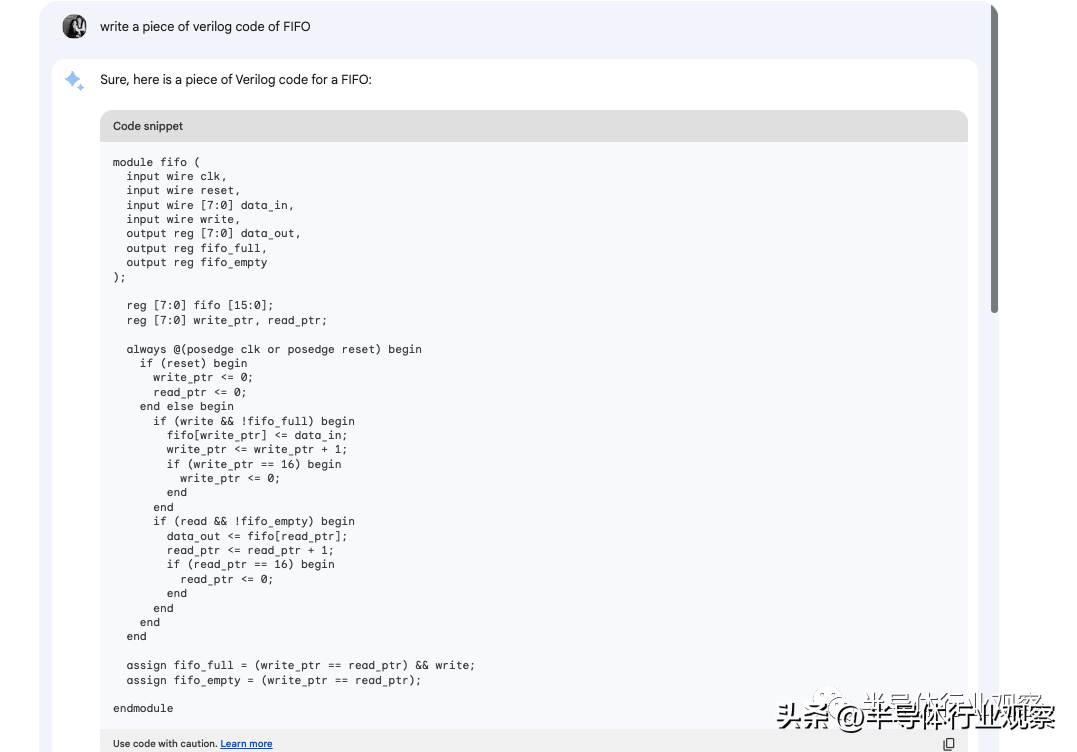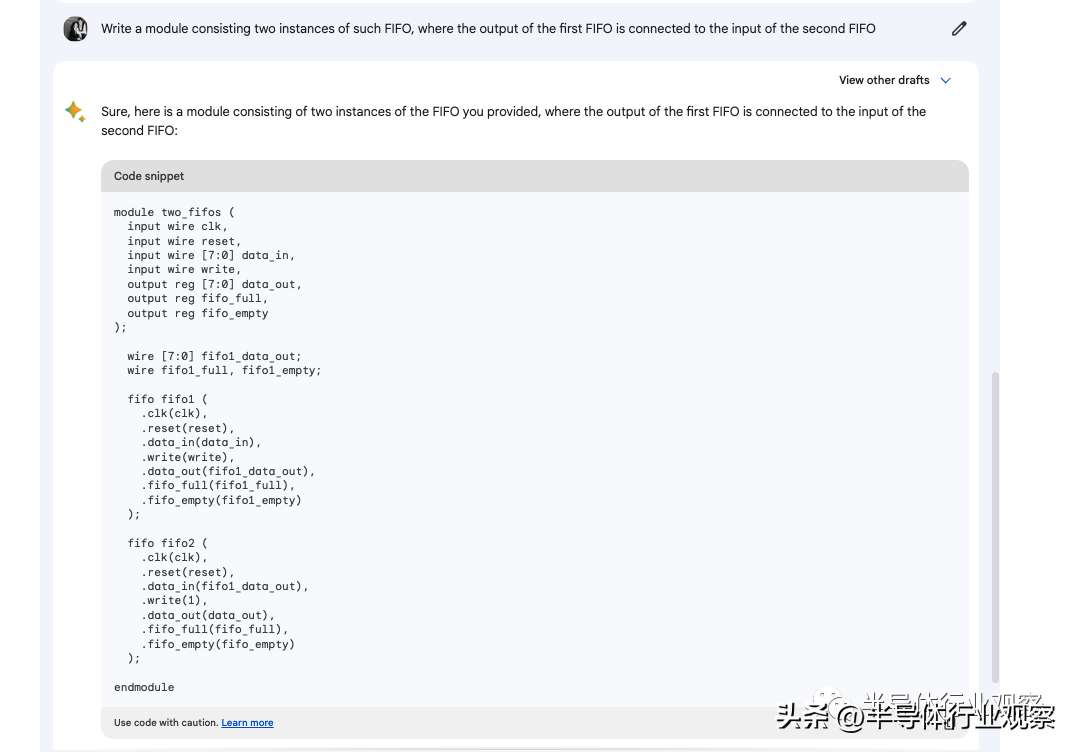 百(bai)聞不如一(yi)試,目前PaLM 2已經在(zai)(zai)谷歌的Bard平(ping)臺上線開放公測,因此我(wo)們也嘗試使(shi)(shi)用(yong)Bard去體(ti)會了(le)一(yi)把(ba)PaLM 2生(sheng)(sheng)成(cheng)Verilog代(dai)(dai)碼(ma)(ma)(ma)的能力。在(zai)(zai)試驗(yan)中(zhong),我(wo)們讓Bard生(sheng)(sheng)成(cheng)了(le)兩段代(dai)(dai)碼(ma)(ma)(ma),一(yi)段代(dai)(dai)碼(ma)(ma)(ma)是(shi)(shi)生(sheng)(sheng)成(cheng)一(yi)個(ge)FIFO(數字電(dian)路中(zhong)最常(chang)用(yong)的模塊(kuai)之(zhi)一(yi)),而(er)另一(yi)段代(dai)(dai)碼(ma)(ma)(ma)則是(shi)(shi)生(sheng)(sheng)成(cheng)一(yi)個(ge)模塊(kuai),其中(zhong)包含了(le)兩個(ge)前面編寫的FIFO,并且讓第(di)一(yi)個(ge)FIFO的輸出接(jie)入第(di)二個(ge)FIFO的輸入。生(sheng)(sheng)成(cheng)的方法非常(chang)簡單,我(wo)們只(zhi)需要給Bard一(yi)個(ge)基于自然(ran)語言(yan)的指(zhi)令(prompt),Bard就能夠(gou)在(zai)(zai)幾秒鐘之(zhi)內完成(cheng)相應的代(dai)(dai)碼(ma)(ma)(ma)生(sheng)(sheng)成(cheng)。例如,在(zai)(zai)第(di)一(yi)個(ge)實驗(yan)中(zhong),我(wo)們使(shi)(shi)用(yong)的指(zhi)令是(shi)(shi)“生(sheng)(sheng)成(cheng)一(yi)段Verilog代(dai)(dai)碼(ma)(ma)(ma)來實現FIFO”,生(sheng)(sheng)成(cheng)結果如下圖: