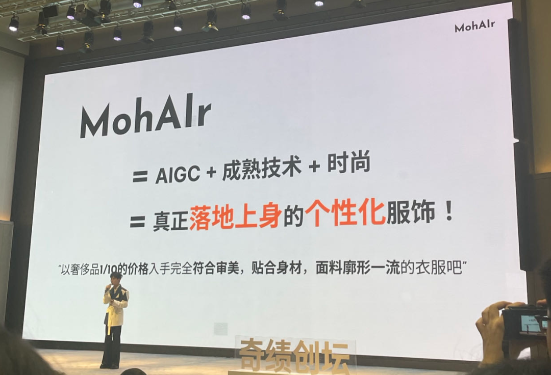 楊光在(zai)臺上演(yan)講(jiang)的時候穿(chuan)的就是MohAIr設(she)計的衣服(fu),他透露,目前產品的內測用戶突破5000名,日均(jun)設(she)計產出(chu)超(chao)過(guo)500套。現場了解到,目前MohAIr衣服(fu)單價在(zai)3000元(yuan)左右,未來也會有希望進一步將(jiang)成本降低。