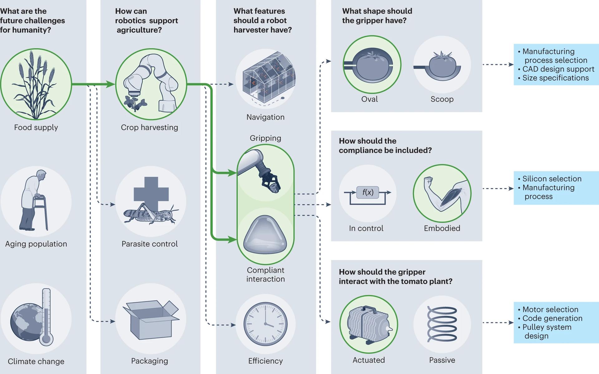 利(li)用LLM對來(lai)自(zi)學術(shu)出版物、技術(shu)手(shou)冊、書籍和媒體的(de)全球(qiu)數據的(de)訪(fang)問(wen),研究人員(yuan)問(wen)人工智能,一個(ge)機(ji)(ji)器(qi)人收(shou)割機(ji)(ji)應該具備哪些功(gong)能。ChatGPT想出了一個(ge)電機(ji)(ji)驅動的(de)抓手(shou),用于將(jiang)成熟的(de)西紅柿從藤(teng)上拉下來(lai)。