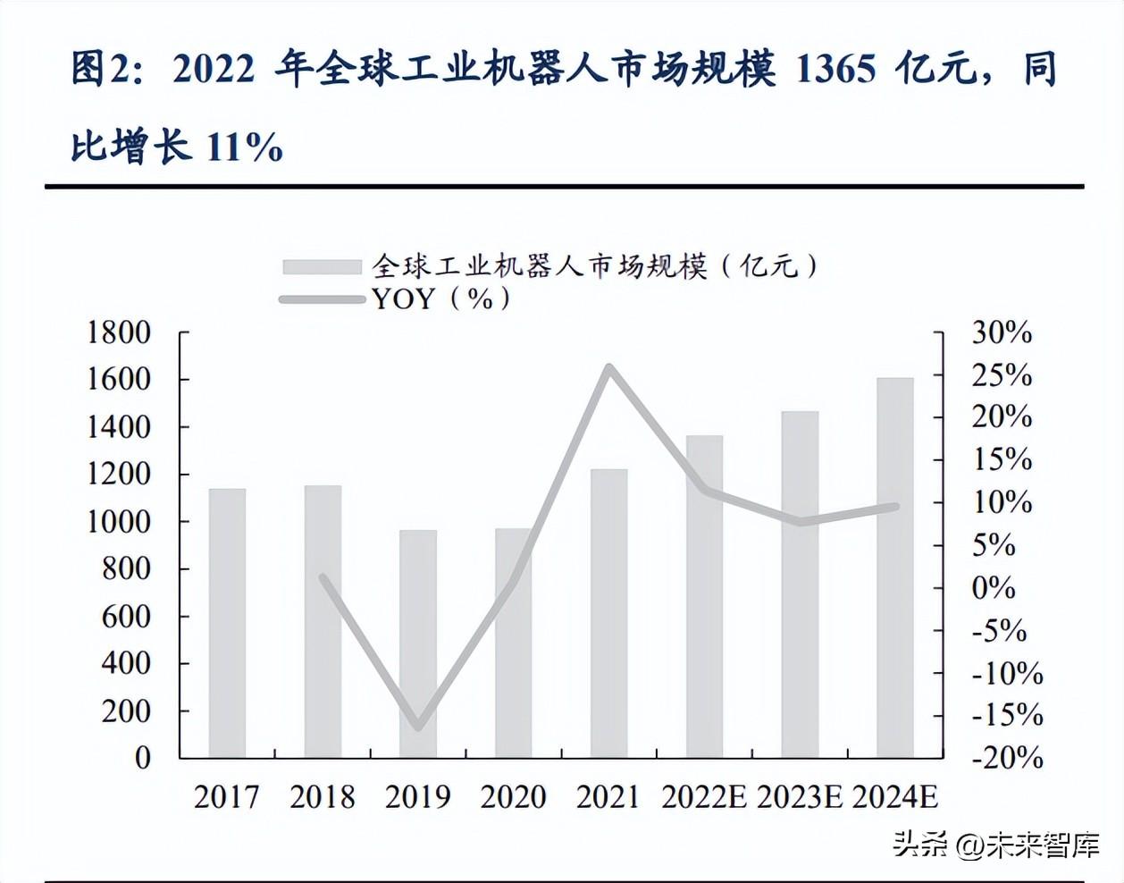 中(zhong)國(guo)為(wei)(wei)工(gong)(gong)業(ye)(ye)機(ji)(ji)器人第一大(da)市(shi)(shi)場,2022 年(nian)(nian)我(wo)國(guo)工(gong)(gong)業(ye)(ye)機(ji)(ji)器人市(shi)(shi)場規(gui)(gui)(gui)模 609 億元(yuan)(yuan),全(quan)(quan)球(qiu)(qiu) 占比(bi) 45%。工(gong)(gong)業(ye)(ye)機(ji)(ji)器人在汽車、電(dian)子(zi)、金屬制品、塑料及(ji)化工(gong)(gong)產品等(deng)行(xing)業(ye)(ye)得到了廣泛的(de) 應用,疫情促使各行(xing)業(ye)(ye)數(shu)字化轉型加快(kuai),機(ji)(ji)器人成為(wei)(wei)企業(ye)(ye)復(fu)工(gong)(gong)復(fu)產的(de)重要工(gong)(gong)具。IFR、中(zhong) 國(guo)電(dian)子(zi)學會(hui)數(shu)據顯示,歷(li)經2019-2020連續兩年(nian)(nian)低(di)迷,2021年(nian)(nian)工(gong)(gong)業(ye)(ye)機(ji)(ji)器人市(shi)(shi)場強勁反彈(dan), 全(quan)(quan)球(qiu)(qiu)市(shi)(shi)場規(gui)(gui)(gui)模達到 1225 億元(yuan)(yuan),同比(bi)增長 26%。作為(wei)(wei)全(quan)(quan)球(qiu)(qiu)制造(zao)業(ye)(ye)中(zhong)心,中(zhong)國(guo)工(gong)(gong)業(ye)(ye)機(ji)(ji)器人 需(xu)求持續擴張,2022 年(nian)(nian)我(wo)國(guo)工(gong)(gong)業(ye)(ye)機(ji)(ji)器人市(shi)(shi)場規(gui)(gui)(gui)模約 609 億元(yuan)(yuan),全(quan)(quan)球(qiu)(qiu)占比(bi) 45%。工(gong)(gong)業(ye)(ye)機(ji)(ji)器 人自動化生產線成套設(she)備已成為(wei)(wei)自動化裝(zhuang)備的(de)主流及(ji)未來(lai)的(de)發展方向,預(yu)計(ji) 2021-2024 年(nian)(nian)全(quan)(quan)球(qiu)(qiu)/中(zhong)國(guo)工(gong)(gong)業(ye)(ye)機(ji)(ji)器人市(shi)(shi)場規(gui)(gui)(gui)模年(nian)(nian)復(fu)合(he)增速 9.5%/15.3%。