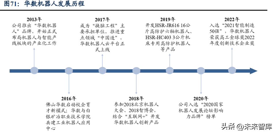 數(shu)(shu)控系(xi)統和伺(si)服電機起家,運控技術積淀深厚。華(hua)(hua)中數(shu)(shu)控是(shi)我國(guo)高端數(shu)(shu)控系(xi)統龍頭, 憑借(jie)深厚的數(shu)(shu)控技術積累,公(gong)司于 2013 年進軍機器(qi)人(ren)(ren)行(xing)業并推出“華(hua)(hua)數(shu)(shu)機器(qi)人(ren)(ren)”品牌(pai)。 截(jie)至(zhi) 2022 年底,華(hua)(hua)數(shu)(shu)機器(qi)人(ren)(ren)已(yi)形成“9+4”機器(qi)人(ren)(ren)布局,即在(zai)佛山、重(zhong)慶、深圳、東(dong)莞、 寧(ning)波、蘇(su)州(zhou)、泉州(zhou)等地設有 9 家機器(qi)人(ren)(ren)公(gong)司,另在(zai)佛山、江蘇(su)、泉州(zhou)、襄陽設有 4 個(ge)機 器(qi)人(ren)(ren)研(yan)究院(yuan),全(quan)面覆蓋(gai)華(hua)(hua)南、華(hua)(hua)東(dong)、華(hua)(hua)中、西(xi)南各大片區的全(quan)國(guo)布局,目前已(yi)具備年產 10000 臺工業機器(qi)人(ren)(ren)的生產能力。