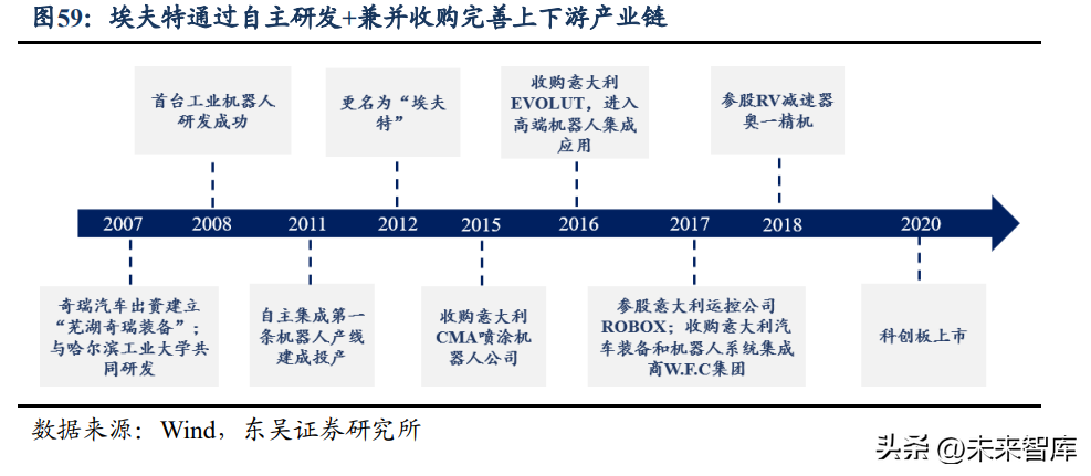 上(shang)中下(xia)游全產業(ye)鏈覆蓋(gai),國內工(gong)業(ye)機器(qi)(qi)人(ren)(ren)第一梯隊。埃(ai)夫特前身為(wei)蕪湖(hu)奇瑞(rui)裝備(bei)有 限(xian)公(gong)(gong)司(si),2007 年(nian)(nian)由奇瑞(rui)汽車出(chu)資建(jian)立,與哈爾濱工(gong)業(ye)大學合(he)(he)作(zuo)研(yan)發(fa)(fa)機器(qi)(qi)人(ren)(ren)。2008 年(nian)(nian)公(gong)(gong) 司(si)自(zi)主(zhu)研(yan)發(fa)(fa)出(chu)第一臺(tai)工(gong)業(ye)機器(qi)(qi)人(ren)(ren),隨后收購意大利噴涂機器(qi)(qi)人(ren)(ren)公(gong)(gong)司(si) CMA、高端機器(qi)(qi)人(ren)(ren) 集(ji)(ji)成(cheng)商 EVOLUT、汽車裝備(bei)集(ji)(ji)成(cheng)商 W.F.C,并(bing)戰略參股控制器(qi)(qi)公(gong)(gong)司(si) ROBOX 和減速器(qi)(qi)公(gong)(gong) 司(si)奧一精機,通過自(zi)主(zhu)研(yan)發(fa)(fa)+外購形成(cheng)上(shang)游零部件到下(xia)游集(ji)(ji)成(cheng)的(de)完整產業(ye)鏈。目前公(gong)(gong)司(si) 已成(cheng)為(wei)國內機器(qi)(qi)人(ren)(ren)行(xing)業(ye)第一梯隊品(pin)牌,與新(xin)松、埃(ai)斯頓(dun)、廣州數(shu)控合(he)(he)稱國產機器(qi)(qi)人(ren)(ren)“四(si) 小龍”,為(wei)客戶提供工(gong)業(ye)機器(qi)(qi)人(ren)(ren)以及跨行(xing)業(ye)智能制造解決方案。