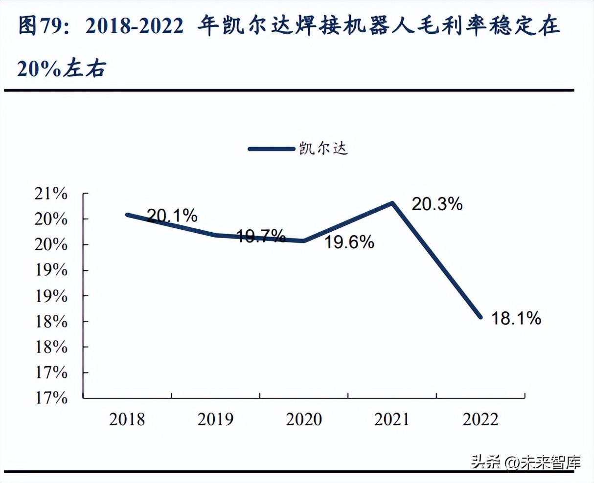 焊接(jie)機(ji)器人營(ying)收(shou)波(bo)動(dong)較大(da),盈利(li)能(neng)力較為穩定。2020 年(nian),凱(kai)爾達開始生產(chan)基(ji)于 EtherCAT 總線技術+工業(ye) PC 的第三代工業(ye)機(ji)器人,當年(nian)營(ying)收(shou)躍升(sheng)至 3.5 億(yi)元,同比增(zeng) 長 119%,創歷史新高。但受疫情導致供(gong)應鏈受阻、經濟增(zeng)速放緩等因素影響(xiang),2021-2022 年(nian)公司(si)焊接(jie)機(ji)器人營(ying)收(shou)同比均有(you)所下滑(hua)。公司(si)近(jin) 5 年(nian)焊接(jie)機(ji)器人毛(mao)利(li)率基(ji)本維持在 20% 左右,2022 年(nian)因下游需求下滑(hua)導致產(chan)能(neng)利(li)用(yong)率下降(jiang),毛(mao)利(li)率略有(you)下滑(hua)至 18.1%。預計隨 下游需求復蘇、自(zi)產(chan)機(ji)器人占比提(ti)升(sheng),盈利(li)能(neng)力有(you)望呈(cheng)現(xian)回升(sheng)趨勢。
