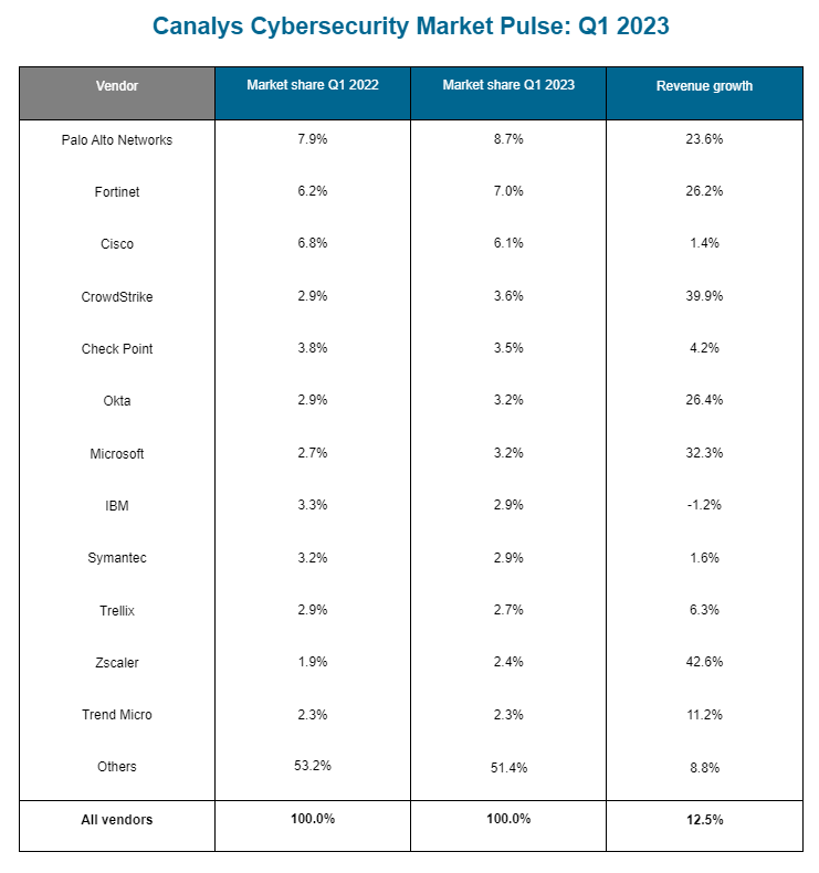 Palo Alto Networks 在第一季度增長了 23.6%,進(jin)一步鞏固了地位,市場份額擴大到 8.7%。