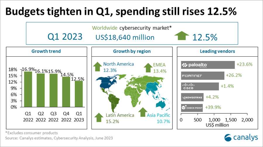 根據市場調查機構 Canalys 公布的最新報告,2023 年第 1 季度全球網絡安全市場規模為 186 億美元(IT之家備注:當前約 1331.76 億元人民幣),同比增長 12.5%,超過了其它科技行業。