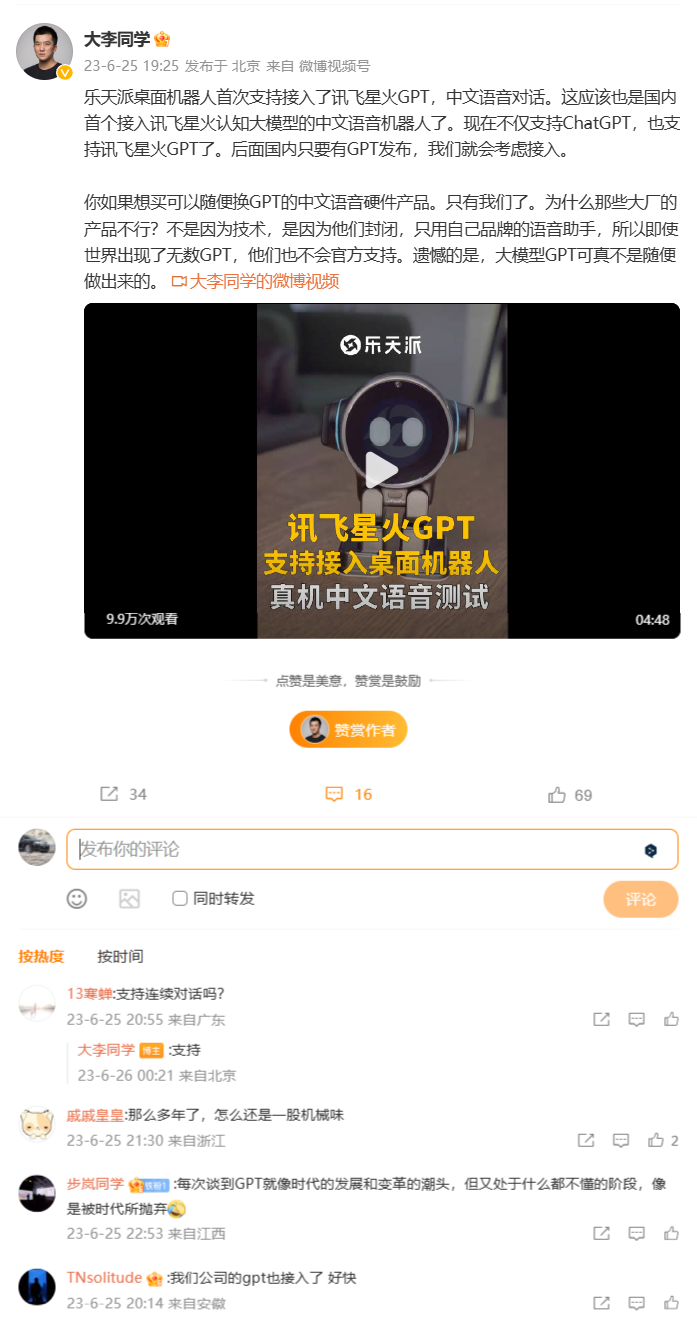 日前,李明在其個人微博官宣,樂天派桌面機器人首次支持接入訊飛星火 GPT 中文語音對話。
