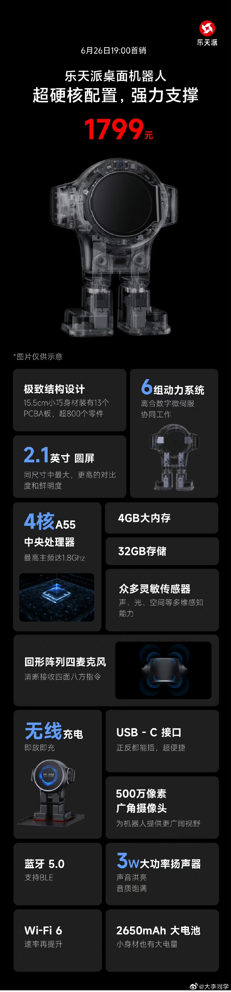 原小米 9 號創始員工李明成立的樂(le)天派公司旗下(xia)首款智(zhi)能(neng)產品 —— 樂(le)天派桌面機(ji)器人 6 月(yue) 18 日(ri)在天貓旗艦(jian)店開售,6 月(yue) 26 日(ri)首銷(xiao),7 月(yue) 10 日(ri)起發(fa)貨,售價 1799 元。