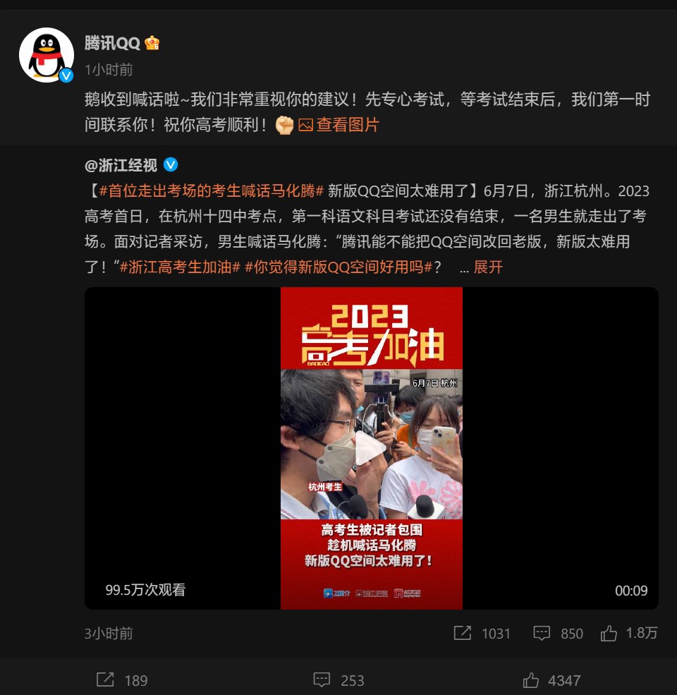 2023 年高(gao)考語文考試(shi)結束后,首位出考場的(de)考生曾面對(dui)媒體采(cai)訪時(shi)向馬化(hua)騰(teng)喊話(hua):“騰(teng)訊(xun)能把 QQ 空間改回老版(ban)本(ben)(ben)嗎?新版(ban)本(ben)(ben)太難用了。”這(zhe)番言(yan)論在(zai)微(wei)博(bo)及空間上(shang)引起(qi)熱議,也(ye)一度沖上(shang)微(wei)博(bo)熱榜。