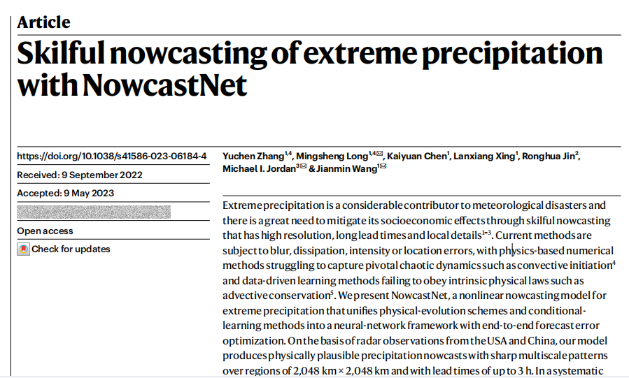 1.Skilful nowcasting of extreme precipitation with NowcastNet.Nature.