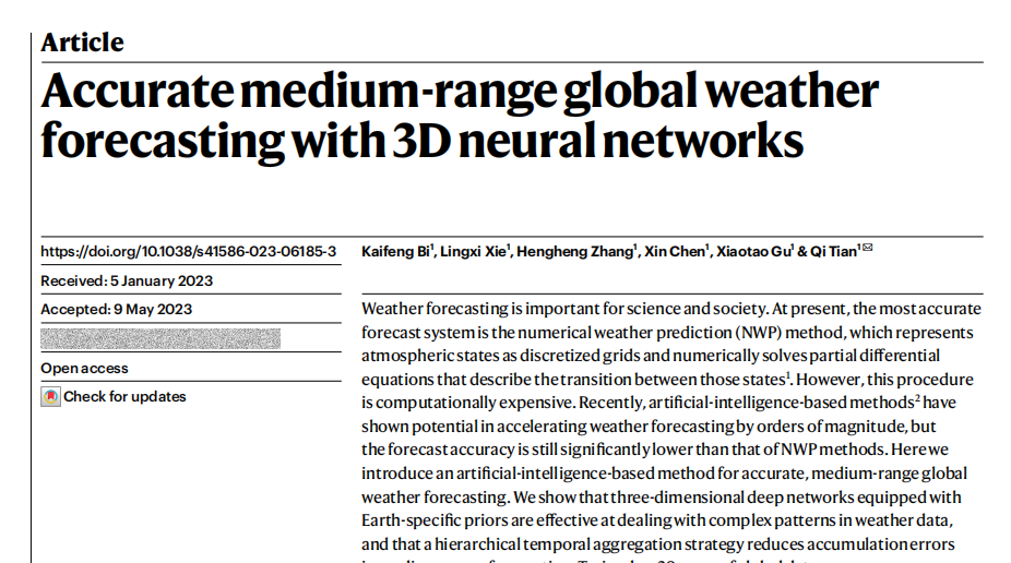 2.Accurate medium-range global weather forecasting with 3D neural networks.Nature.