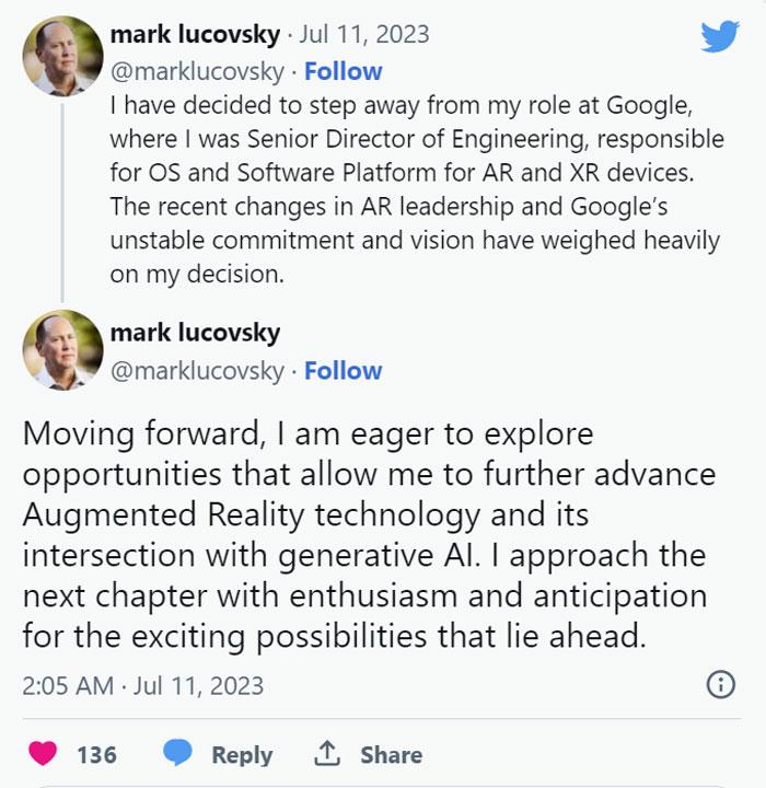 這(zhe)一(yi)情(qing)況(kuang)同(tong)樣造成了馬克·盧科夫斯基曾的(de)(de)(de)離開。他在Twitter中寫道(dao),由于“AR業務管(guan)理層的(de)(de)(de)變動,以及谷歌對AR優柔不(bu)定(ding)的(de)(de)(de)承諾和愿景”,自(zi)己(ji)將離開谷歌。但(dan)這(zhe)位業內大牛強調,自(zi)己(ji)接(jie)下來將繼續(xu)AR方面的(de)(de)(de)研發,以及生(sheng)成式AI在AR方面的(de)(de)(de)應用。