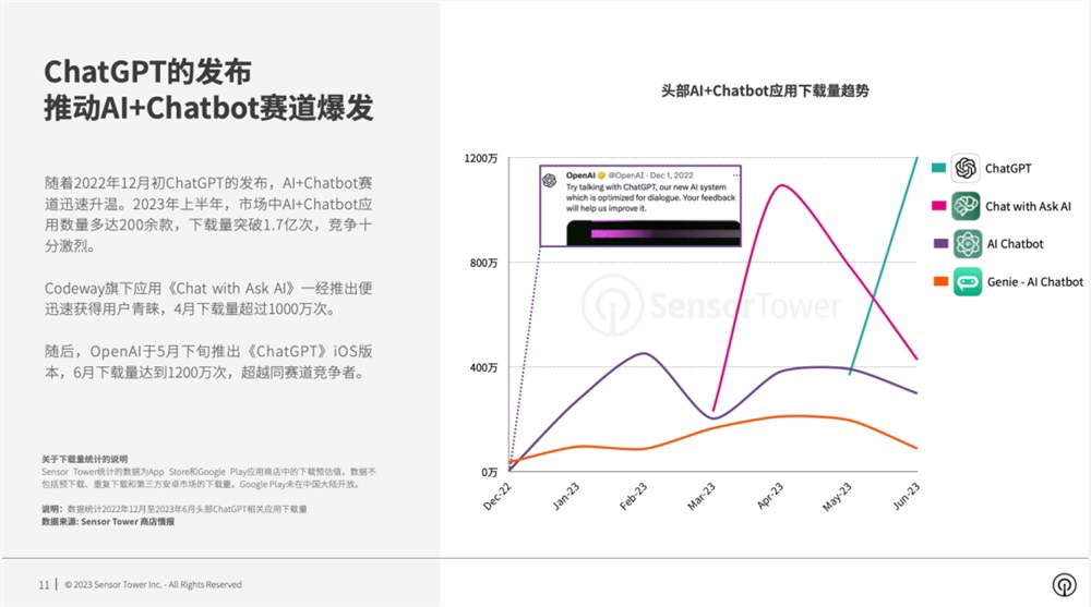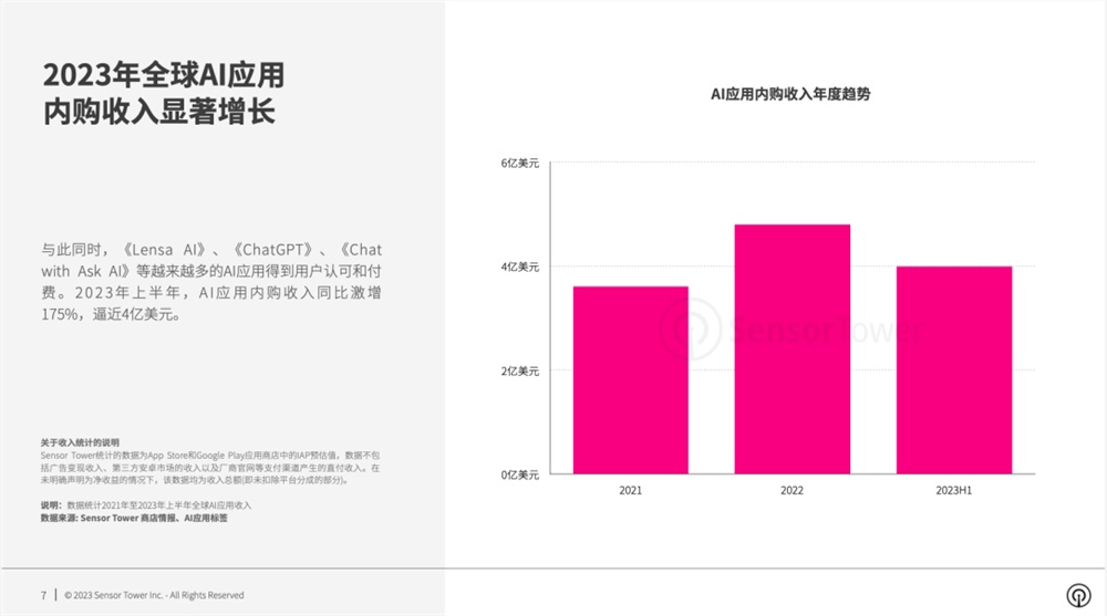 據悉,2023 年 AI 應用下載量同比增長 114%,突破 3 億次,超過 2022 年全年水平。同(tong)時,AI 應用內購收入同(tong)比增長 175%,接(jie)近(jin) 4 億美元(IT之家注:約 28.71 億元人民幣(bi))。