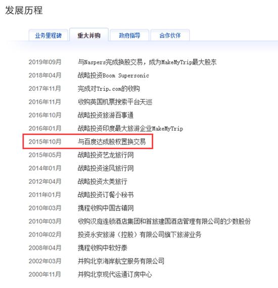 攜(xie)程(cheng)官網顯示,自(zi)2000年以來(lai),攜(xie)程(cheng)完成多項重大(da)并購,尤其(qi)是在(zai)2015年與百度(du)達成股權置換交易后,攜(xie)程(cheng)的(de)全球(qiu)化布局加速。