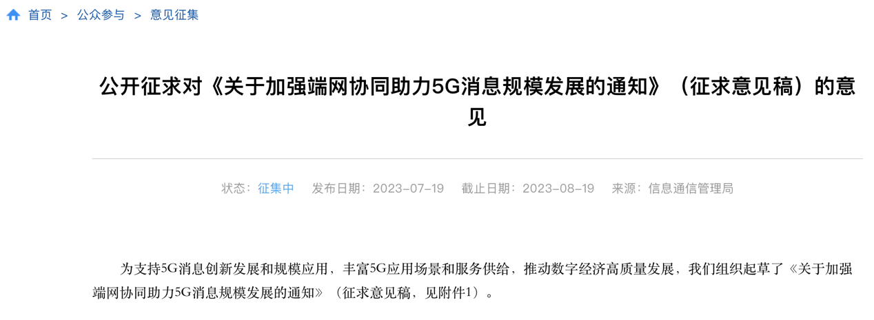 工(gong)信部在官網發布(bu)消(xiao)息稱,為支(zhi)持5G消(xiao)息創新發展(zhan)和規(gui)模應(ying)用,豐富5G應(ying)用場景(jing)和服務(wu)供給,推動(dong)數字經濟高質量發展(zhan),我們(men)組織起草了《關于加強(qiang)端網協同助力5G消(xiao)息規(gui)模發展(zhan)的通(tong)知》(征求意見稿)。