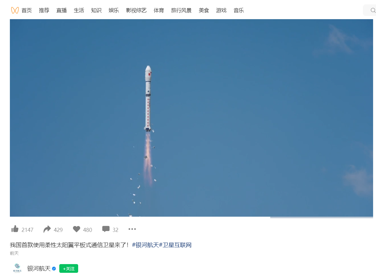 ▲ 銀河航(hang)天(tian)(tian)靈犀(xi) 03 星柔性太陽翼展開狀態,圖源(yuan)銀河航(hang)天(tian)(tian)公眾號