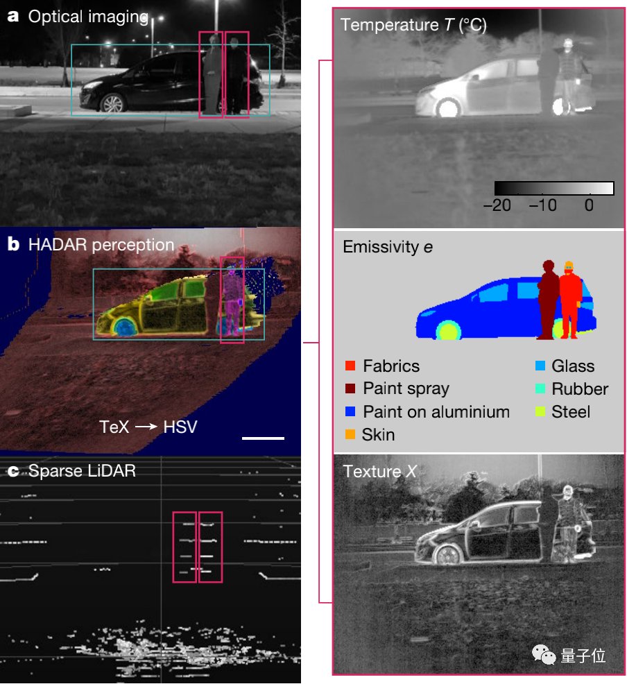視覺驅動的物體檢測在光學成像(xiang)中(a)錯(cuo)誤地識(shi)別出(chu)了兩(liang)(liang)個(ge)人(ren)(ren)和(he)一(yi)輛(liang)汽車(che),而激光雷達點(dian)云(yun)(c)不但(dan)識(shi)別到兩(liang)(liang)個(ge)人(ren)(ren)還把汽車(che)給丟了,只有 HADAR 方法能夠帶來全面的理解(jie),準確(que)框出(chu)一(yi)人(ren)(ren)一(yi)車(che)。