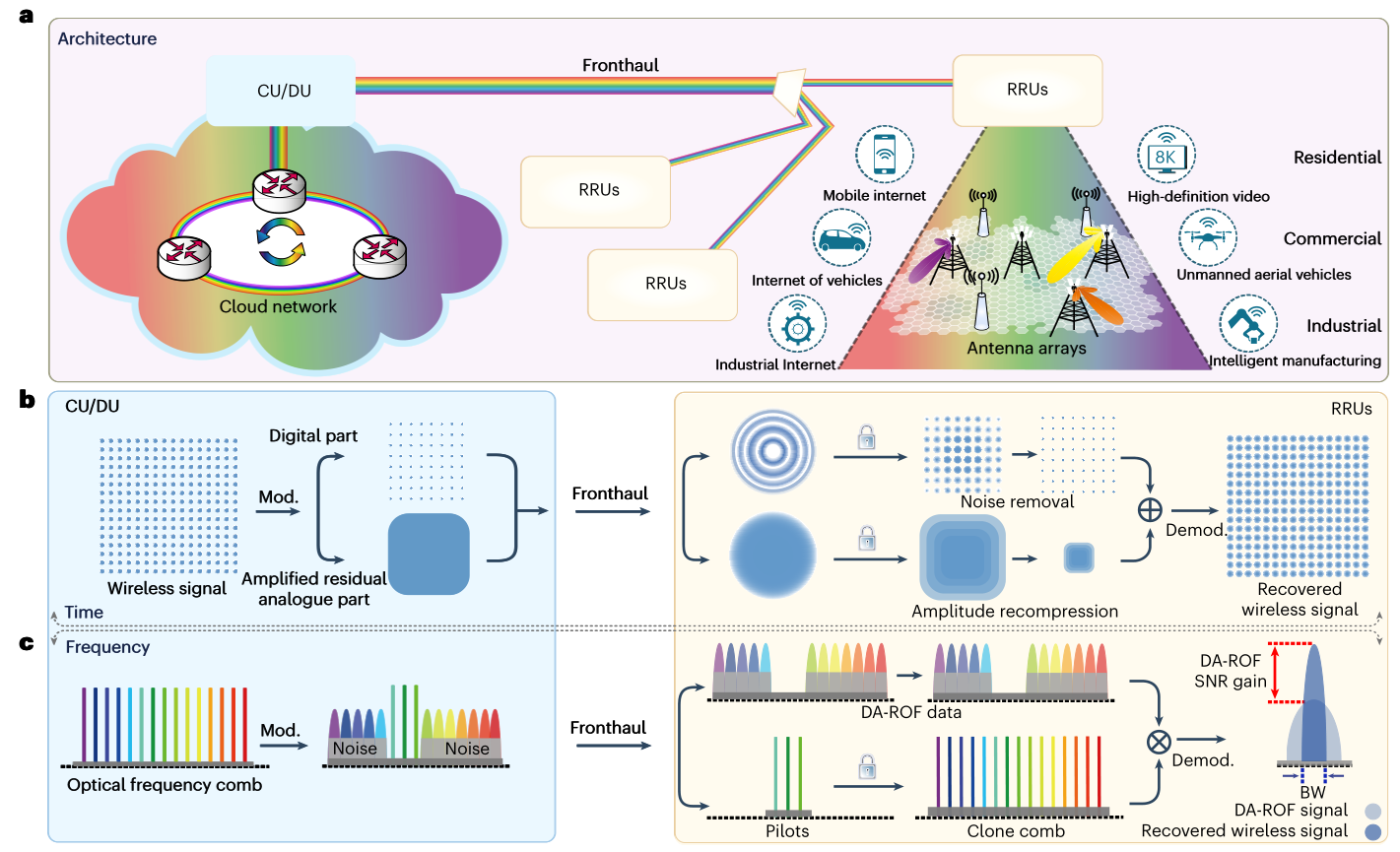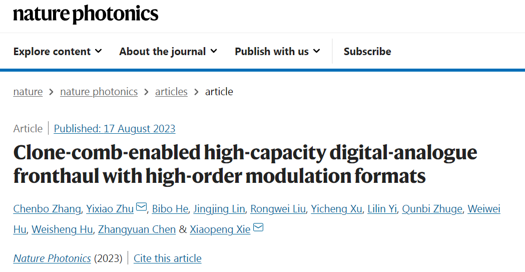 近期,同屬區域光纖通信網與新型光通信系統國家重點實驗室的北京大學電子學院微波光子團隊與上海交通大學電子工程系新型光網絡研究團隊合作,針對后5G時代光載無線接入網容量和信噪比受限的挑戰,創造性地提出了基于克隆光梳的數字模擬混合前傳接入架構,成功實現了超大容量和超高制式的無線信號前傳接入。2023年8月17日,相關研究成果以“克隆光梳賦能大容量高調制格式數字模擬前傳”(Clone-comb-enabled high-capacity digital-analogue fronthaul with high-order modulation formats)為題,在線發表于《自然·光子學》(Nature Photonics)。