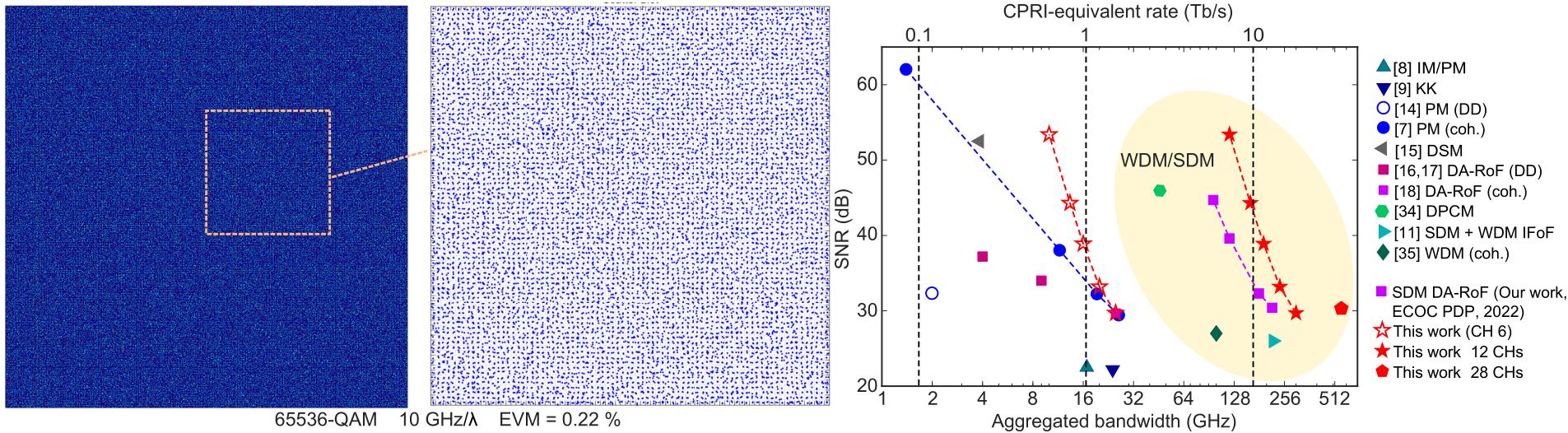 65536-QAM制式信號實驗結果和研究成果對比(研究團隊的成果見紅色和紫色標記)