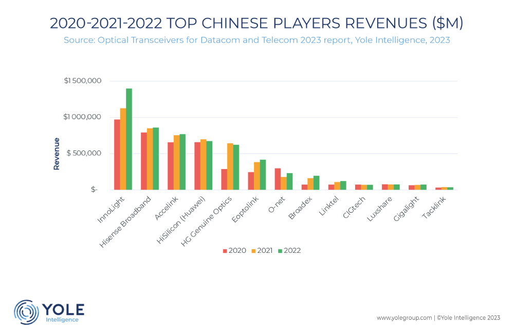 另外,Yole Intelligence研究員分析師Eric Mounier指出,憑借不斷追趕和加速發展的計劃,中國在光通信行業的地位日益突出。如今,雖然美國和日本在高速模塊的核心光學技術方面領先,但中國已在GaAs、InP和SiPh等平臺投入大量資金,因此中國光芯片生產有(you)望進一步加速。